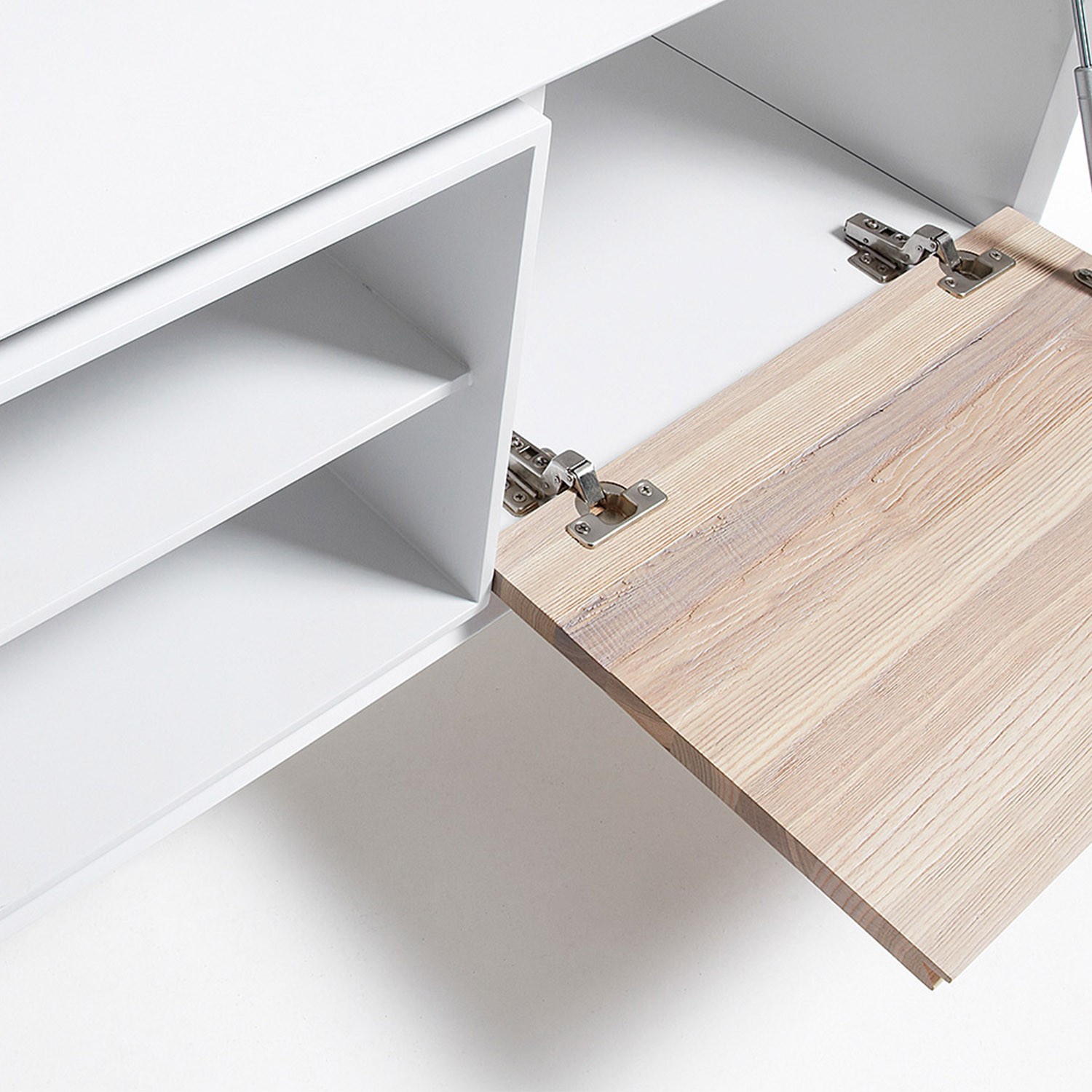 Su estructura consta de un tablero de fibra de madera lacada blanca suspendido sobre cuatro patas de madera maciza de fresno, es recomendable para salones espaciosos debido a su tamaño y a la vez modernos. Un elemento que no defraudará.