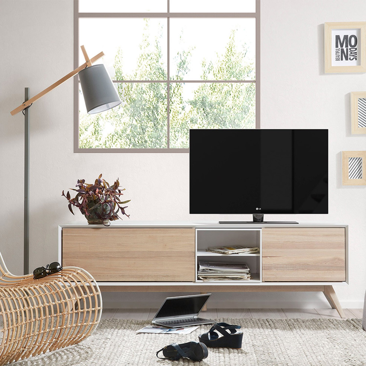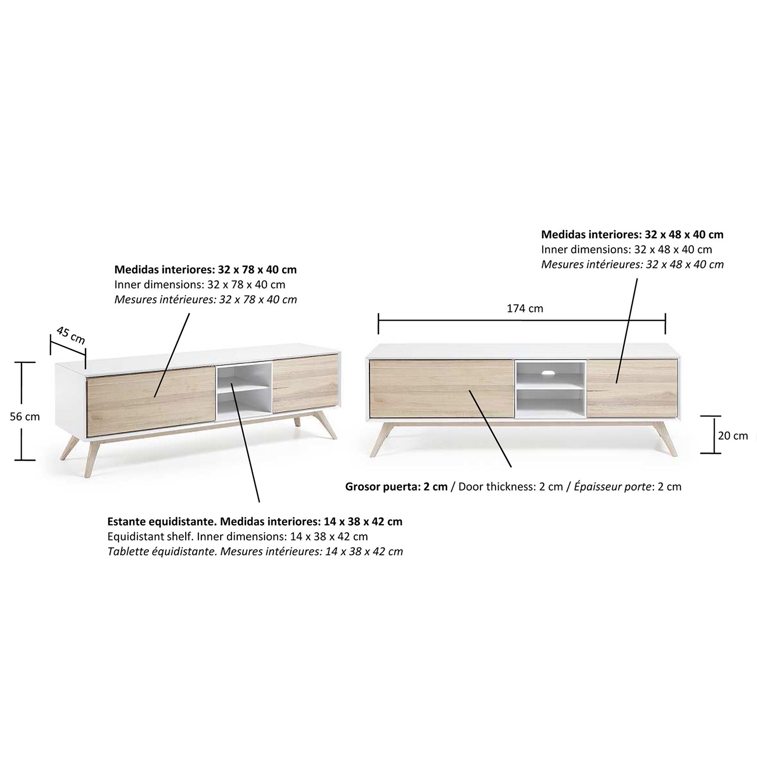 Se trata de un mueble muy parecido a su hermano menor, de 134cm, pero estructurado de diferente forma. Consta de dos puertas, a izquierda y derecha del mueble, ambas de tamaños diferentes. Mientras tanto, en la zona central dispone de dos compartimentos, ideales para guardar cosas que desees tener a mano.