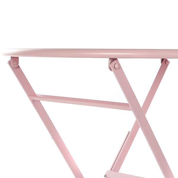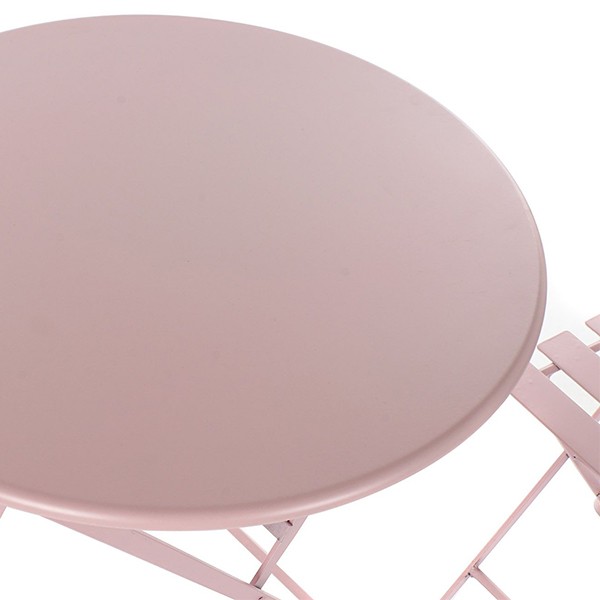 Color: Rosa. Materiales: Metal. Medidas mesa: Medida alto: 70 cm. Medida diámetro: 61 cm. Medidas sillas: Medida alto: 80.5 cm. Medida ancho: 36 cm. Medida profundo: 40.5 cm. Medida alto asiento: 43.5 cm.