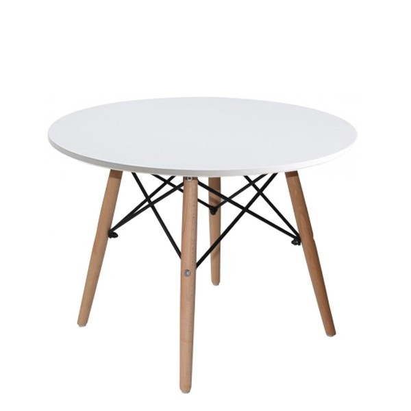 Fabricada la mesa en DM en color blanco y patas en madera con cruceta en metal negro, lo mismo que la base de la silla junto con su asiento en una sola pieza en plástico de color blanco.
