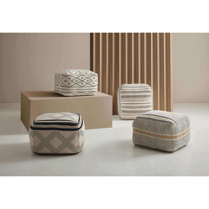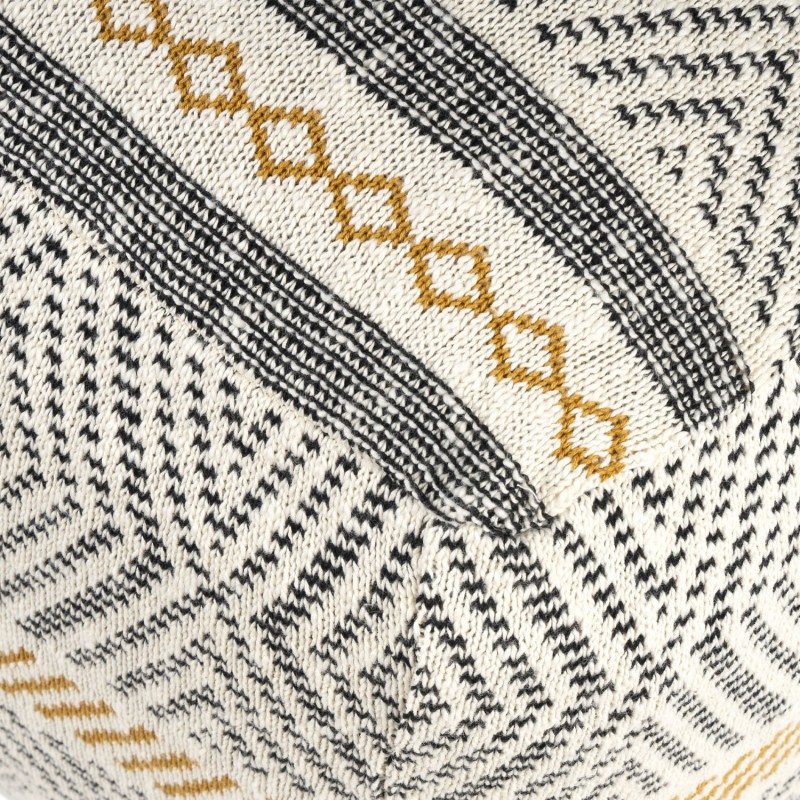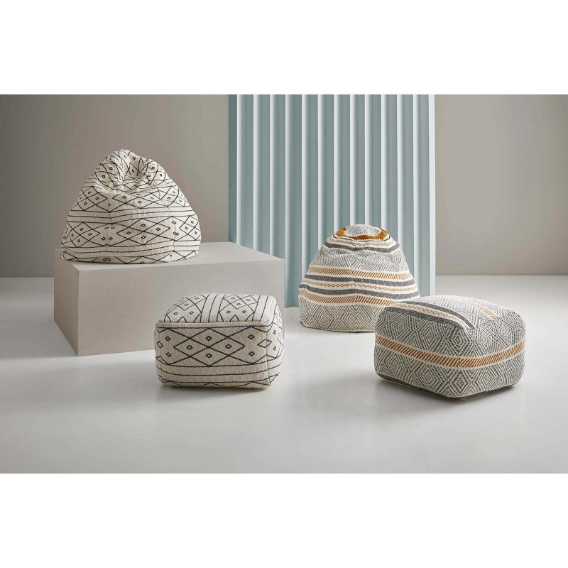 Por ello, debes conocer el puff COWA. Se trata de un modelo de forma cuadrada y realizado en tejido de algodón color blanco, dispone de unos dibujos en colores negro y mostaza creando figuras geométricas variadas.