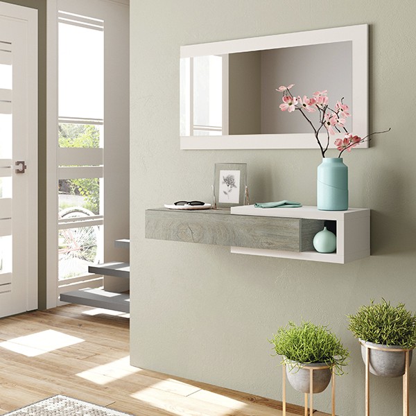 Con un estilo moderno, unas líneas sofisticadas y con el que podrás dar tu toque. Fabricado en melamina de color roble alaska y blanco, es reversible, por lo que puedes colocarlo como desees. Dispone de un amplio cajón con el que podrás guardar tus llaves, cartera o lo que necesites. Su amplio espejo te permitirá darte ese último vistazo antes de salir. Sus colores son cálidos y aportarán luz a tu hogar.