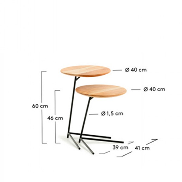 Si has respondido afirmativamente, tienes a tu alcance el set de dos mesas auxiliares HECGAR. Se tratan de dos modelos de distintas alturas, ambos con sobres redondos diseñados en madera natural de acacia y sostenidos mediante tres patas entrecruzadas de metal en acabado color negro.