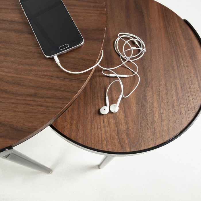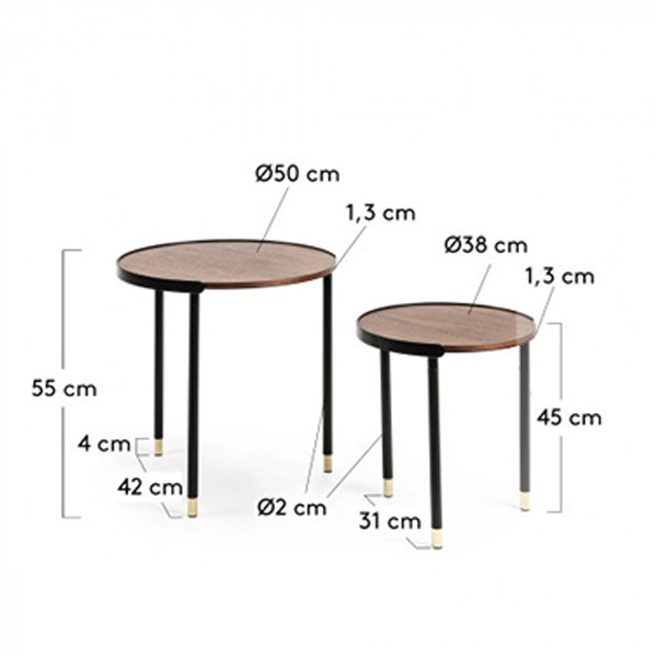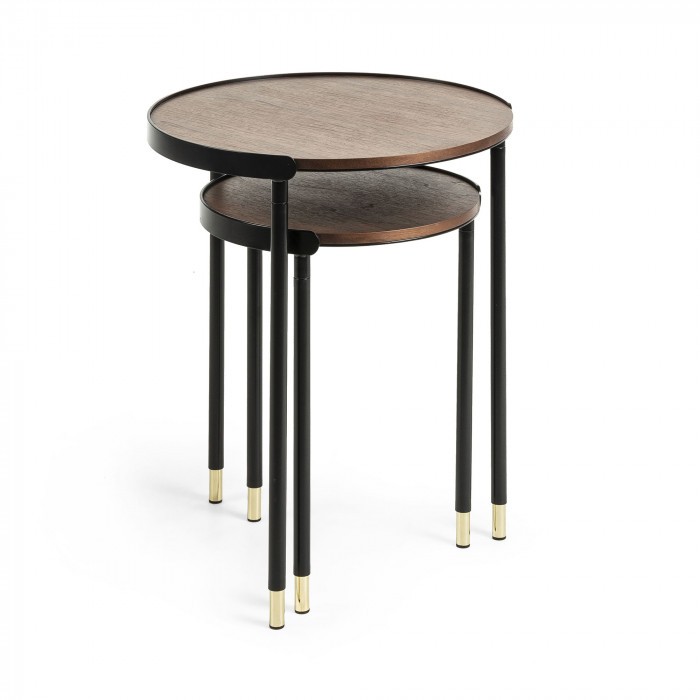 Se trata del set de dos mesas auxiliares WULEI, dos modelos de diferentes alturas y diámetros variados, formadas por sobres presentados en forma redonda y realizados mediante madera chapada de nogal. Cada sobre se sostiene por tres patas diseñadas en metal acabado en color negro para finalizar en dorado en sus extremos inferiores.