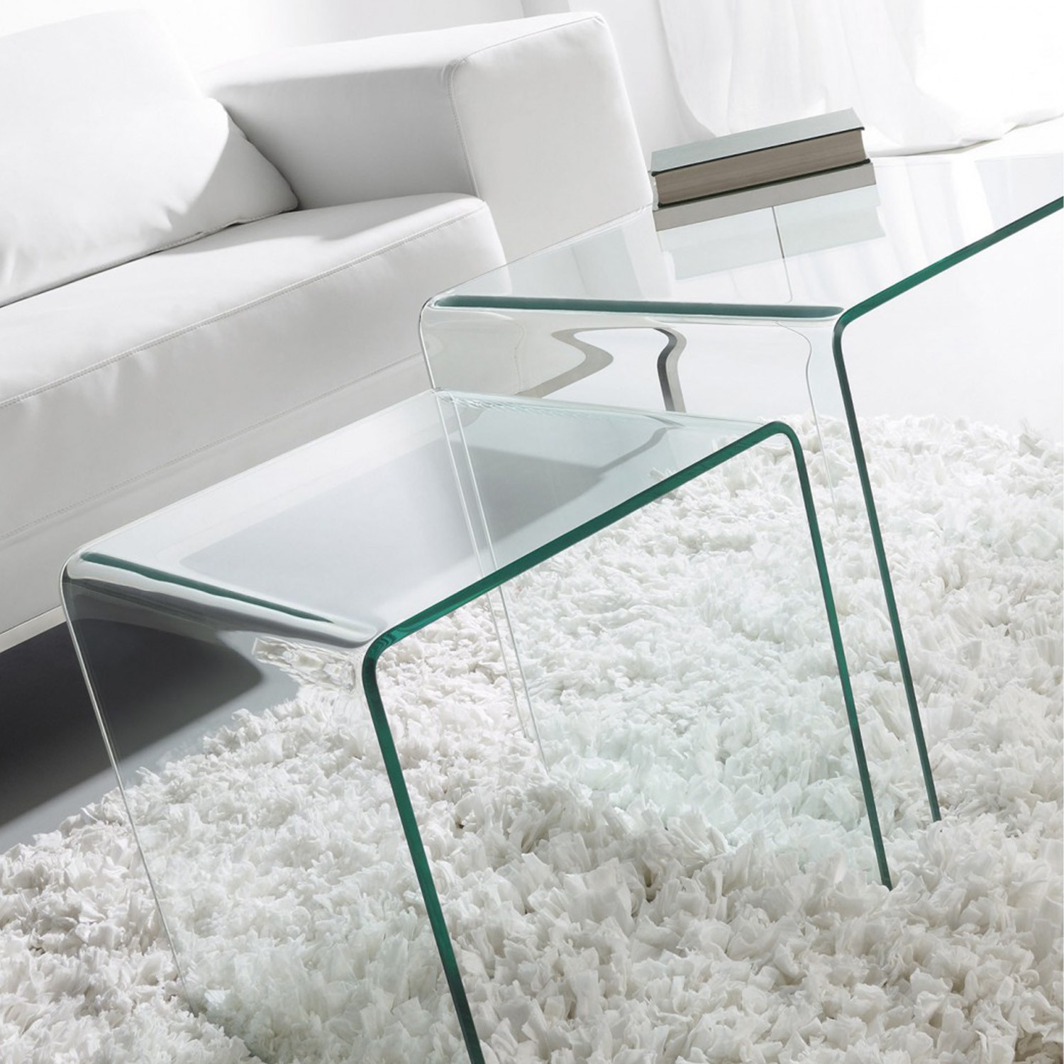 Si si, no engañamos a nadie con el fabuloso set de dos mesas nido BURANO GLASS. Dos mesas que, en ningún caso llegan a superar los 50 centímetros de altura, por lo tanto, puedes utilizarlas a modo de mesa auxiliar o como mesas de centro. Ambos modelos están fabricados en cristal templado transparente y comparten forma, asemejándose a una letra "U" invertida.
