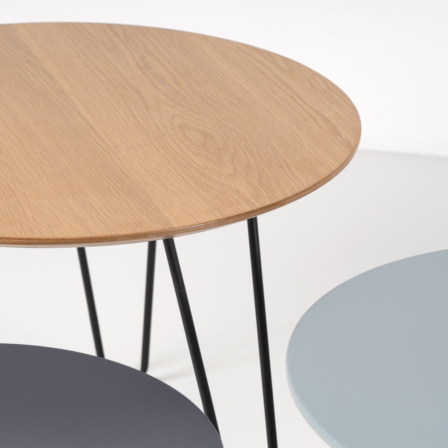 Se trata de tres mesas redondas, cada una de una altura (45, 40 y 35 centímetros respectivamente), formadas por tres sobres diferentes. El de mayor tamaño está realizado en madera en acabado color roble, el mediano en color azul, mientras que el más pequeño es de color gris. Pero los tres comparten el diseño de sus patas, utilizando el metal en acabado de color negro.