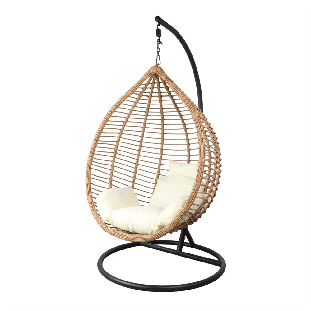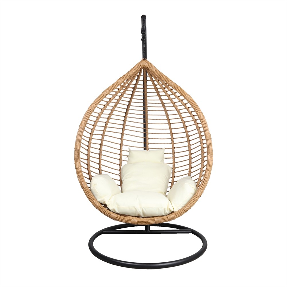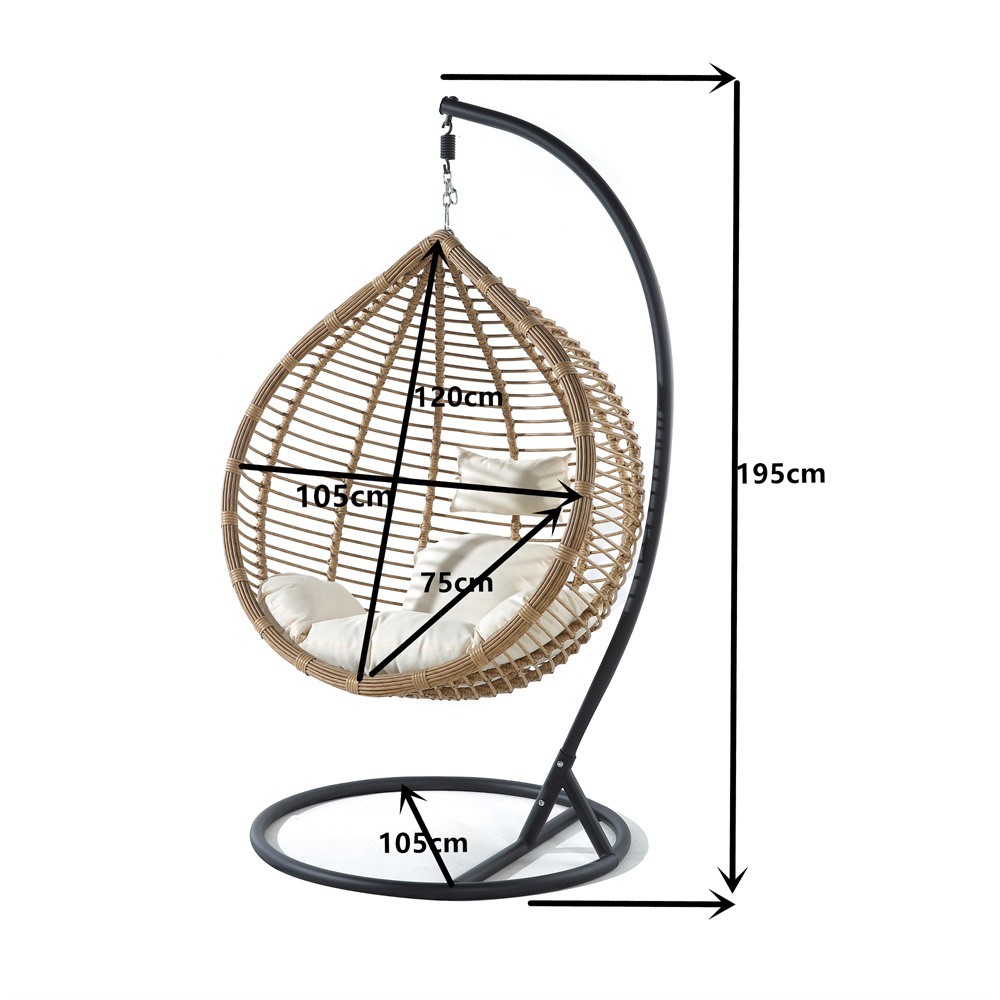 La silla colgante TINNIT no viene sola, sino que incluye los cojines que ves en la imagen en un bonito color gris claro, además del soporte de acero, lo que hará que puedas moverla de lugar o ajustar su posición según la conveniencia.