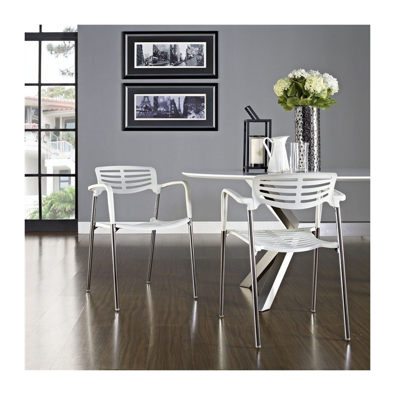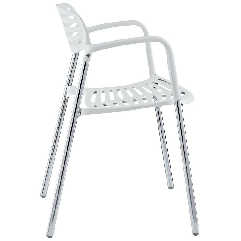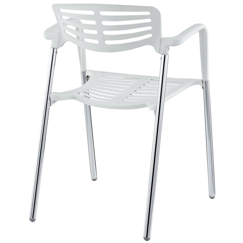 Se trata de una silla formada por un asiento y respaldo realizado en polipropileno, un plástico de alta calidad en color blanco, ofreciendo una gran resistencia. Y si ya contaba con firmeza suficiente, además, le acompañan cuatro patas de metal en acabado cromado.