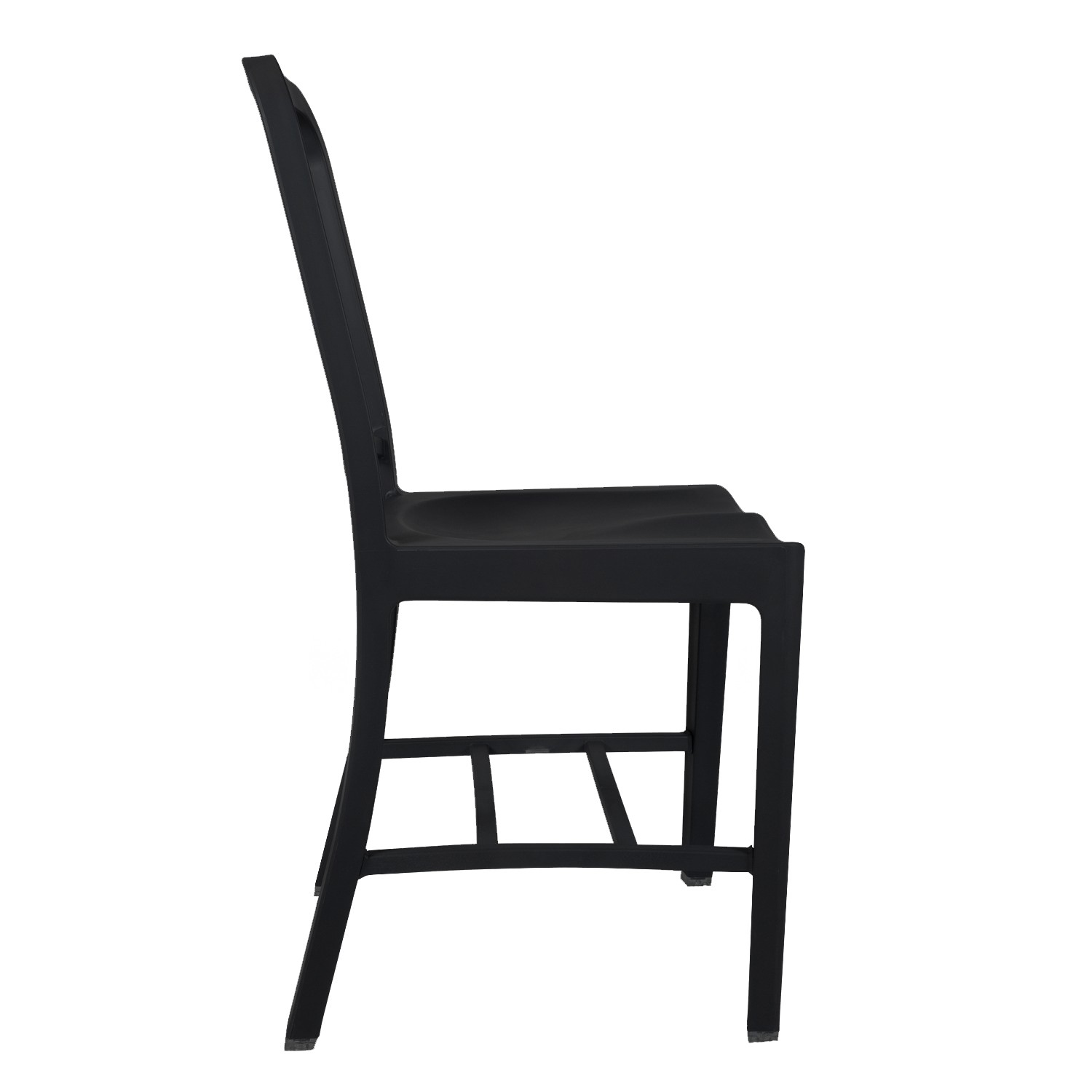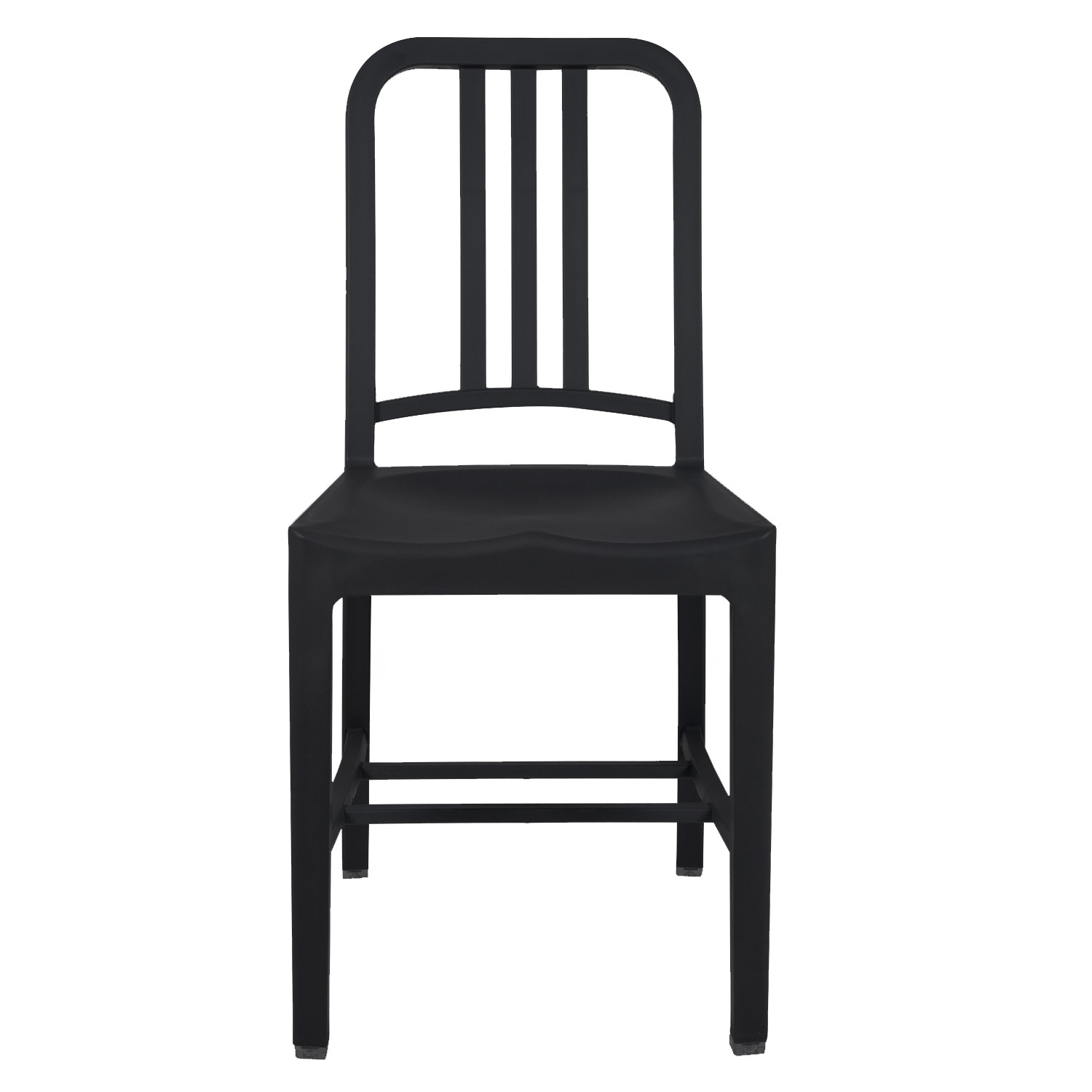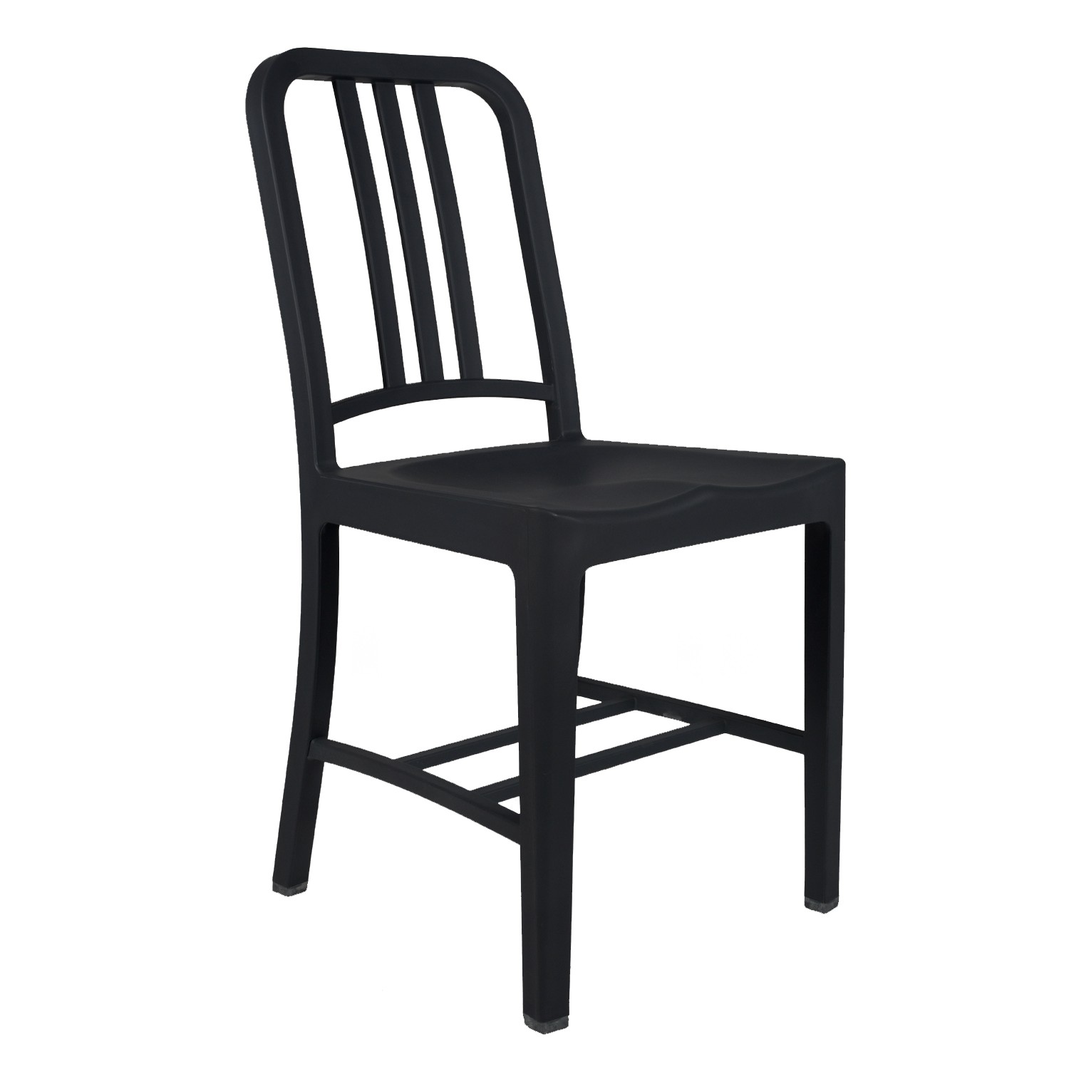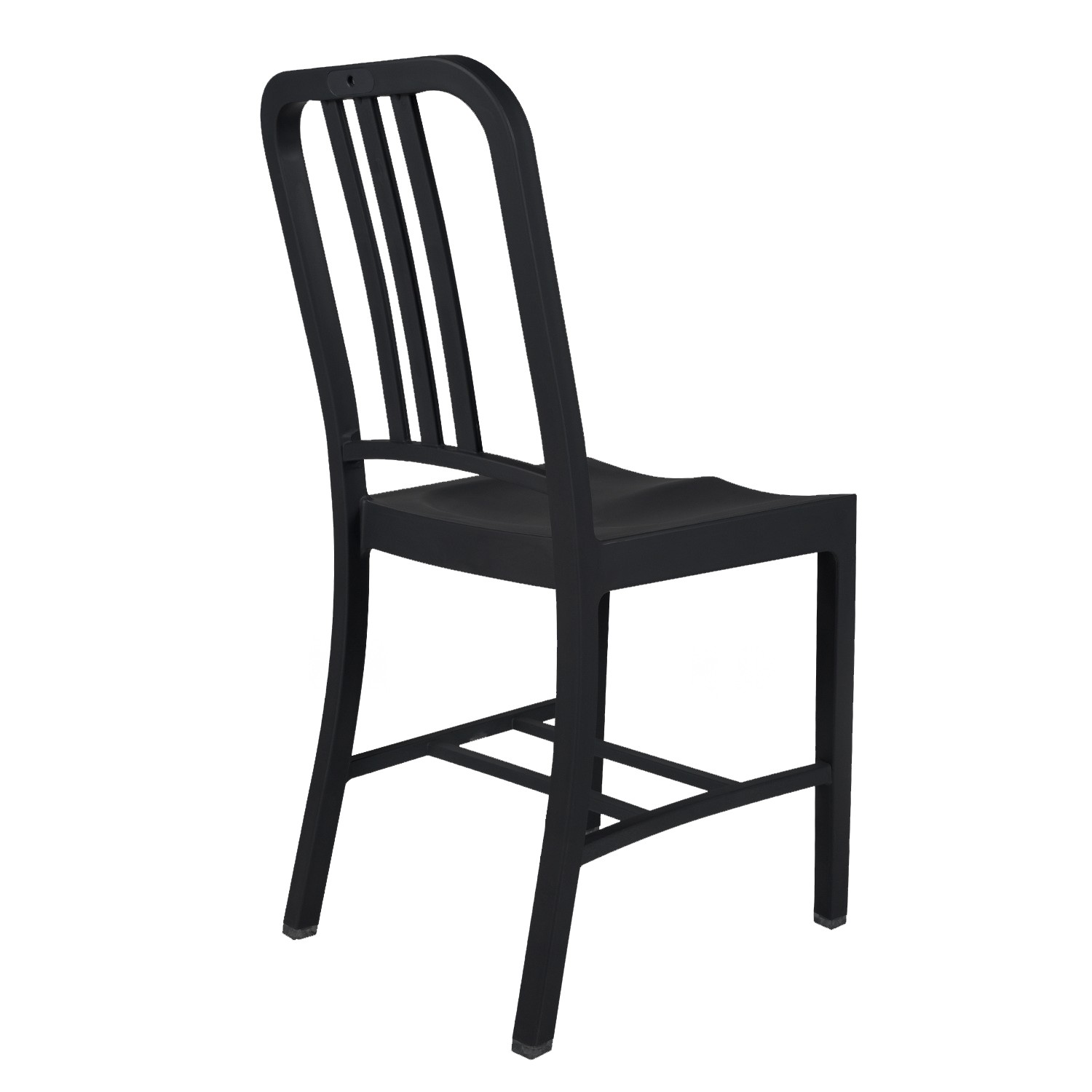 De apariencia sencilla se precisaban hasta 77 pasos diferentes para terminar cada una de las unidades del modelo original, ahora, inspirándonos en la creación de Emeco, reversionamos la silla de cocina NAVY en material de plástico polipropileno y fibra de vidrio de color negro con un tratamiento especial que permite su uso en exterior.
