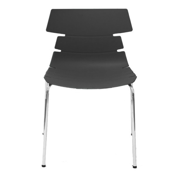 Carcasa monoblock de polipropileno en color negro, material plástico de gran resistencia y durabilidad. El armazón inferior lo forman las cuatro patas fabricadas en metal y acabado cromado, con topes para proteger los diferentes suelos.