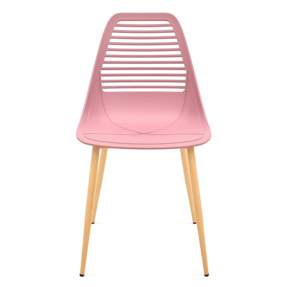 Su composición en estructura metálica pero de imitación madera contrasta muy bien con el asiento de polipropileno color rosa, otorgándole un aire muy delicado y decorativo.