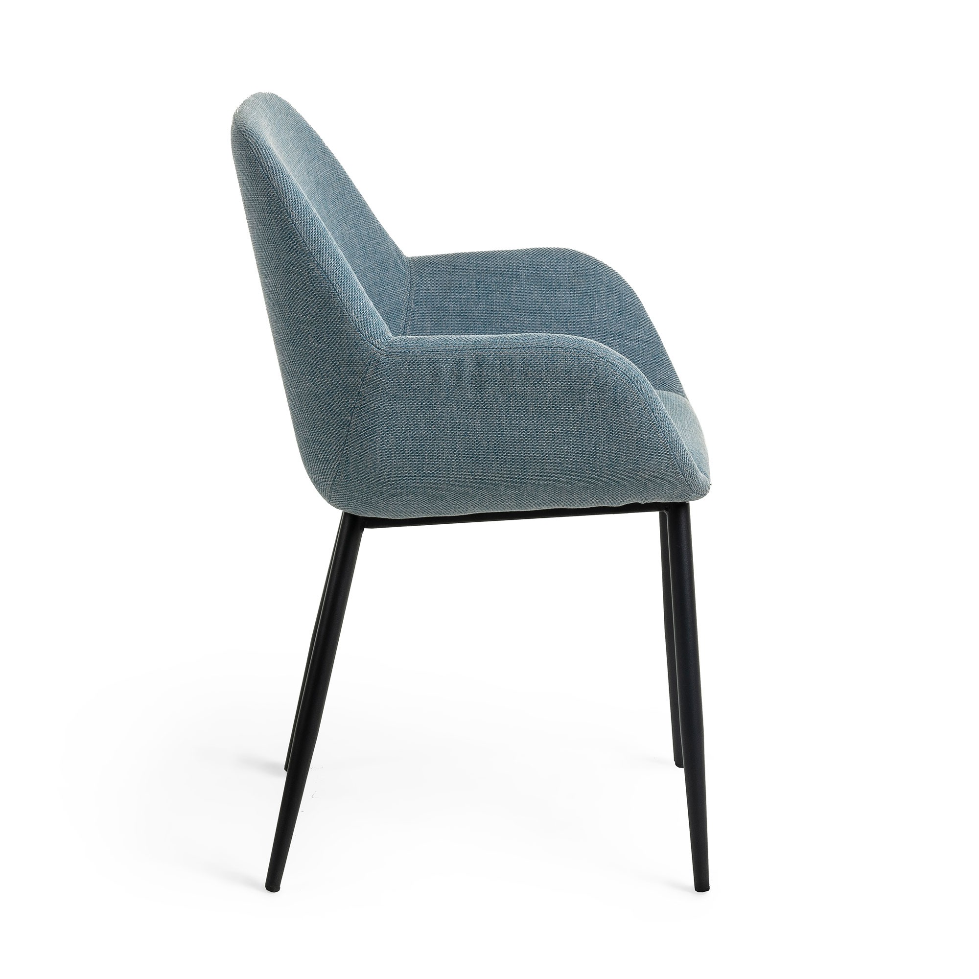 Se trata de un modelo formado por un asiento y un respaldo de pieza única, tapizado en tejido acabado en una tonalidad azul oscuro, apoyado sobre cuatro patas metálicas pintadas por pulverización en color negro. Una silla elegante, que busca una mesa apropiada para, entre ambas, tener un espacio precioso.