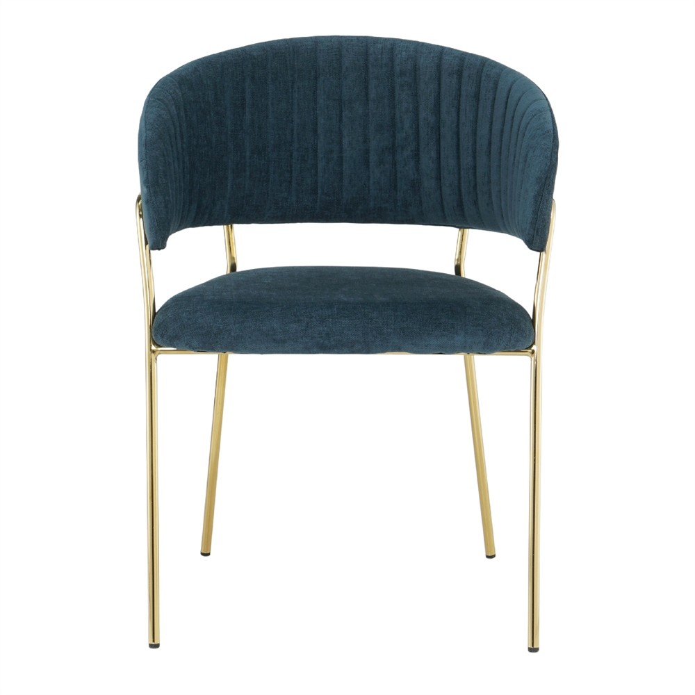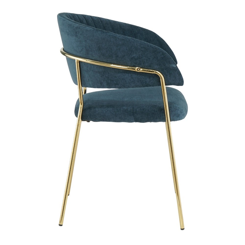 Como podrás ver en la imagen, la silla de comedor LUCCA tiene un asiento y respaldo tapizado en tejido color azul, su diseño hace que aporte sofisticación a la estancia, además tiene un tacto suave, haciéndola acogedora.