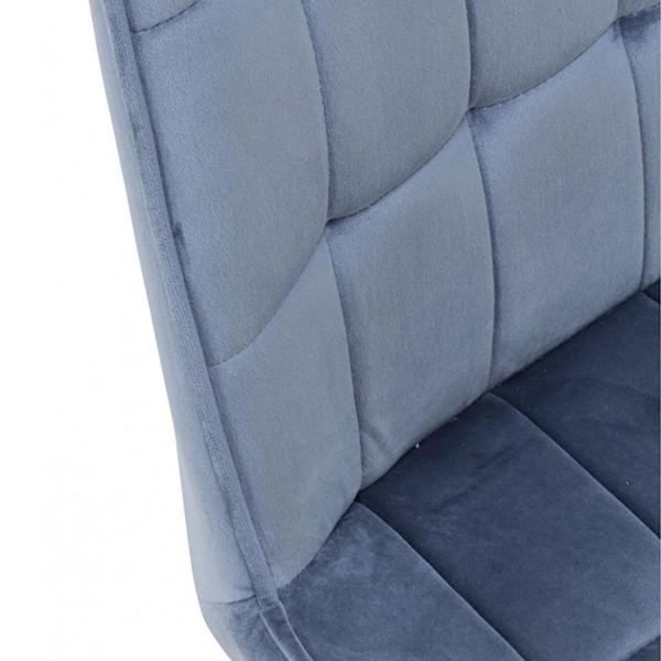 Consta de un asiento y un respaldo de pieza única, tapizado en un suave tejido de terciopelo acabado en color azul oscuro, y se sostiene gracias a cuatro patas metálicas, de gran estabilidad, finalizadas en negro.