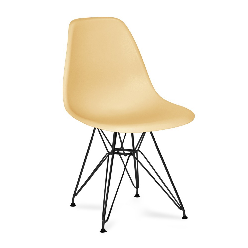 Una silla de gran calidad, resistencia y durabilidad, con base de 4 patas de metal lacado en negro, formada por varillas entrelazadas, recordándonos a la torre Eiffel, inspirada en el diseño de los iconos del mobiliario Charles y Ray Eames.