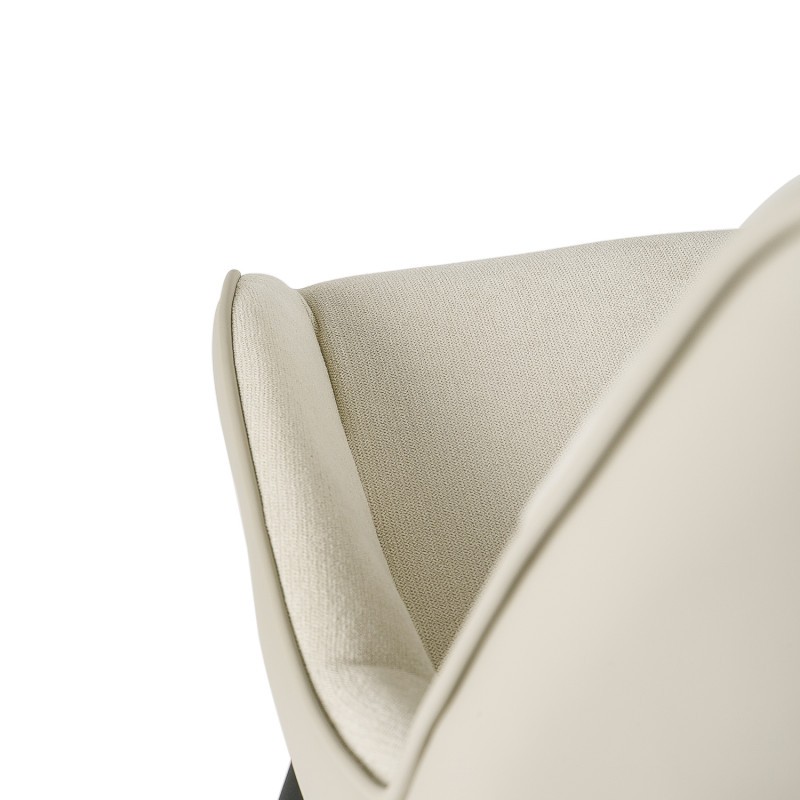 Una silla que mezcla materiales distintos, aunque su combinación da lugar a un producto realmente espectacular. Cuatro patas de metal en color negro se encargan de sostener un asiento y un respaldo de pieza única, con una obertura en la parte baja de este último. El material empleado es el tejido en su cara interior, mientras que la exterior es de polipiel, y el color con el que termina es una agradable tonalidad beige.