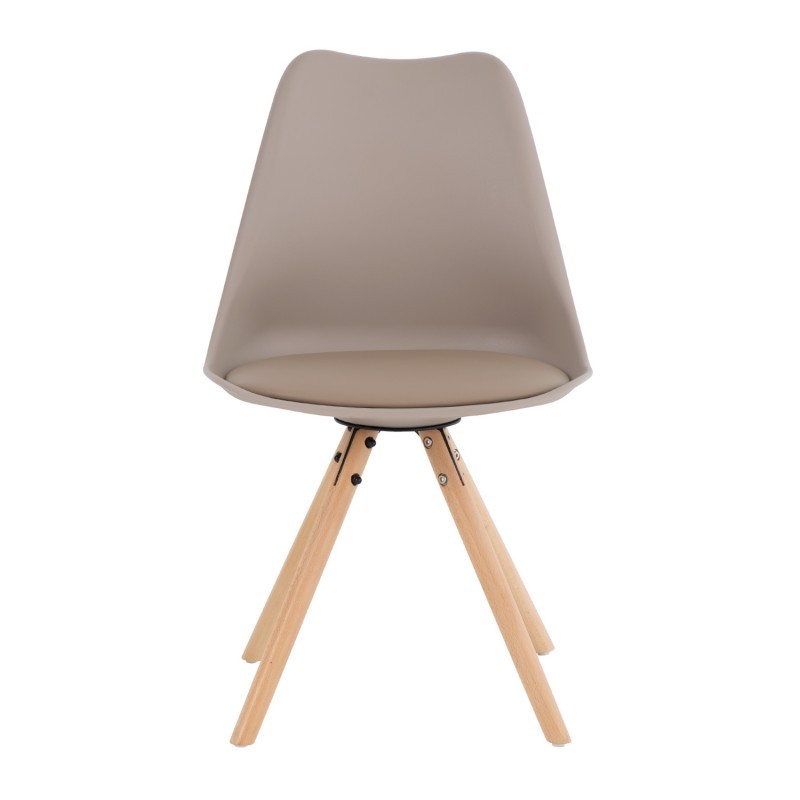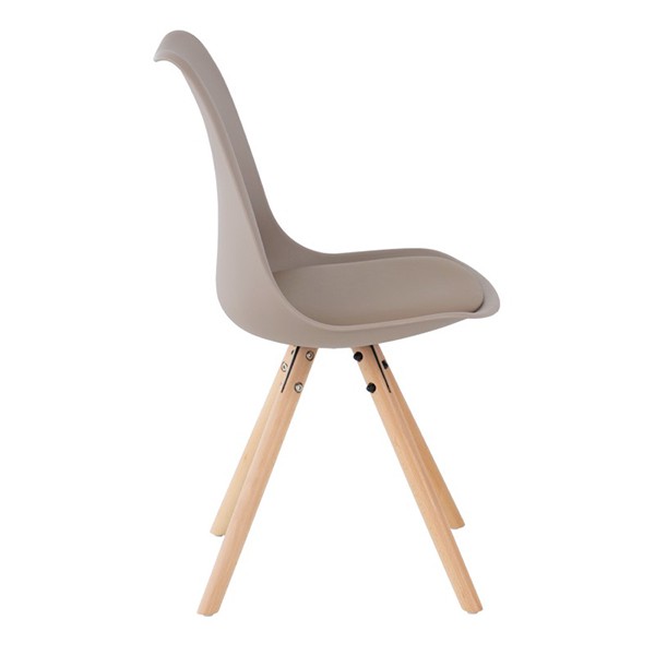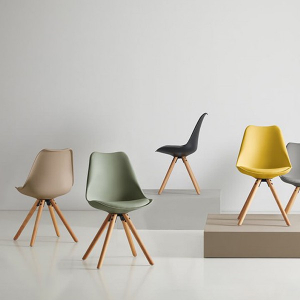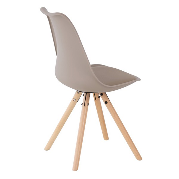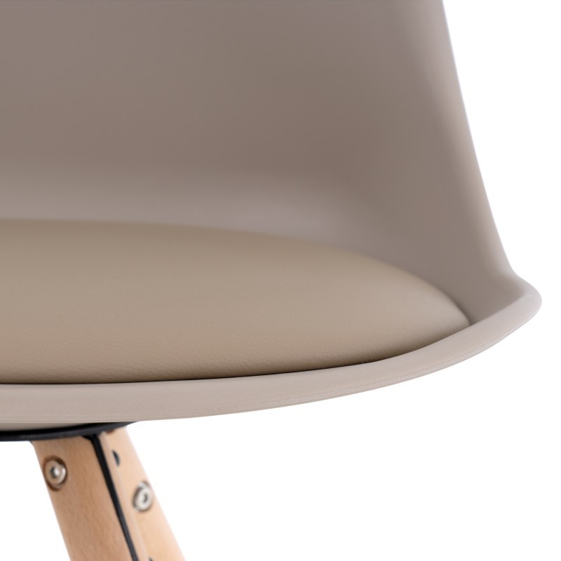 La silla de comedor FLAK está fabricada en plástico, polipropileno, de un suave ton beige, con cojín tapizado en polipiel de alta calidad del mismo color y tiene unos pies en forma de trípode hechos en madera de haya, la cual nos recuerdan a otros diseños como la famosa silla DSW o la silla TULIP.