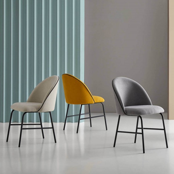 Y este color es el que utiliza la silla de comedor FREYJA para su tejido que cubre la totalidad del asiento y del respaldo redondeado, con un bonito ribete en color negro. Incorpora también cuatro patas en metal de color negro.