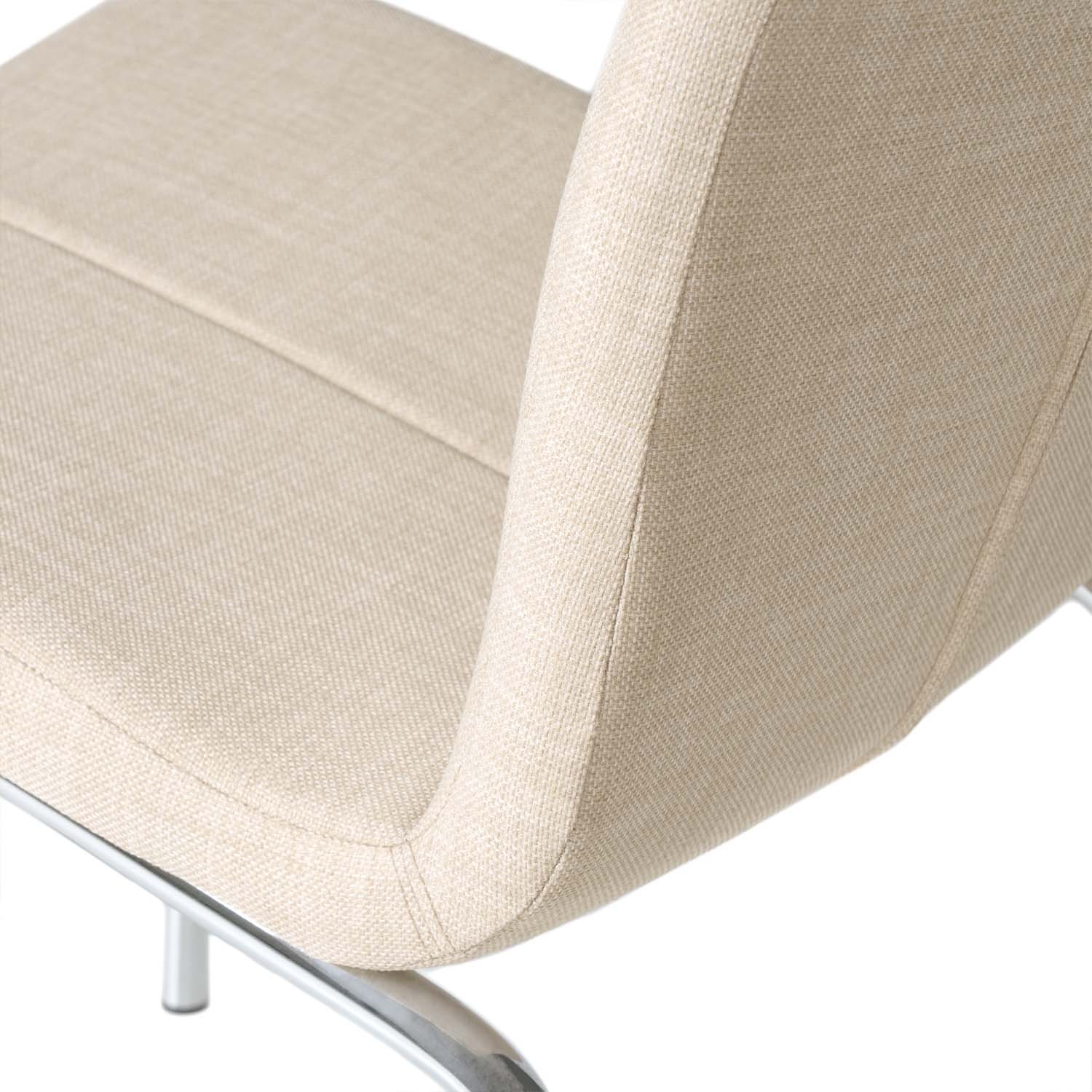La forma un asiento y un respaldo de pieza única, tapizado en un elegante color beige, con una franja vertical que divide a ambos en dos partes simétricas. Le acompañan cuatro patas de metal cromado, dos de ellas, las delanteras, totalmente rectas, mientras que las traseras cuentan con una ligera curvatura.