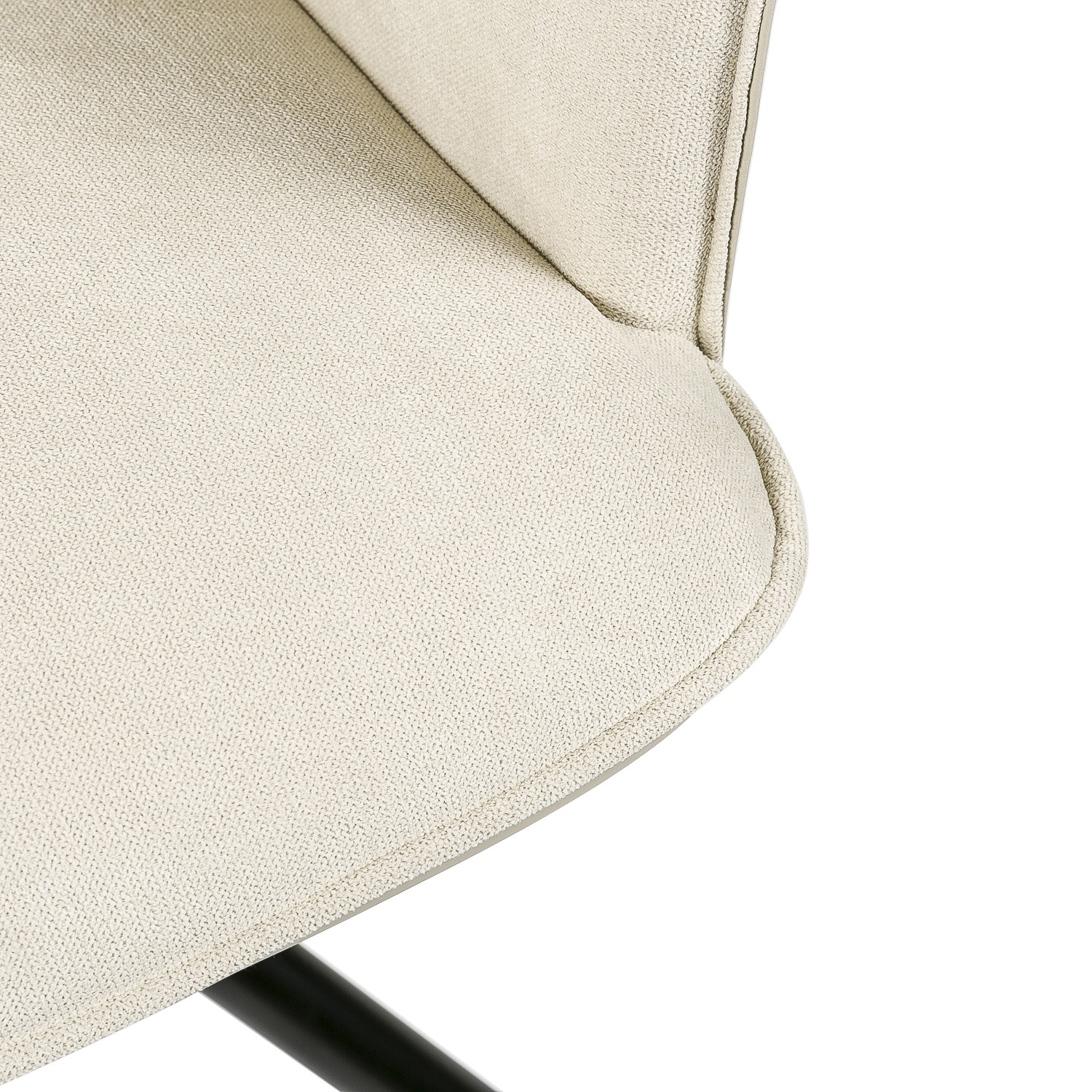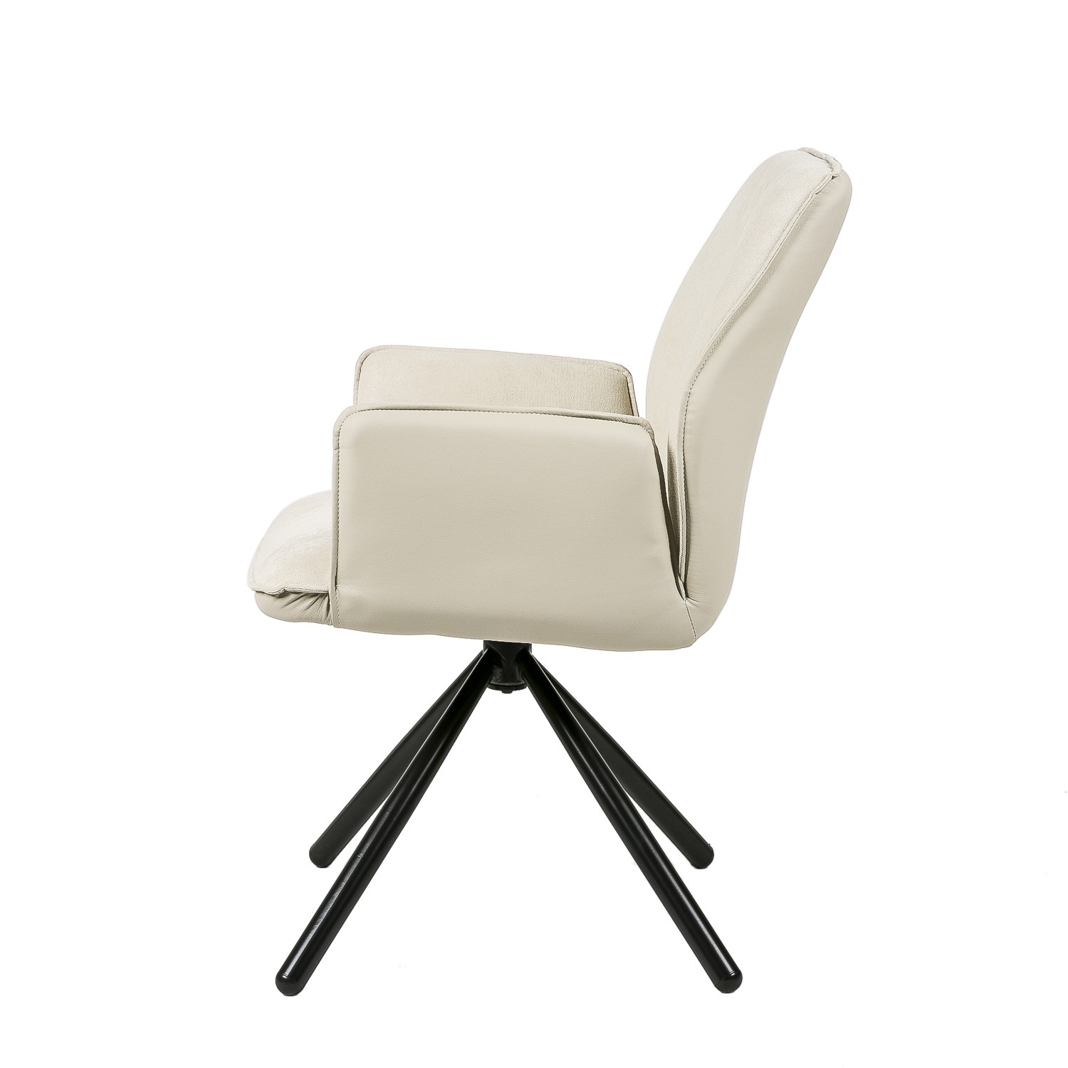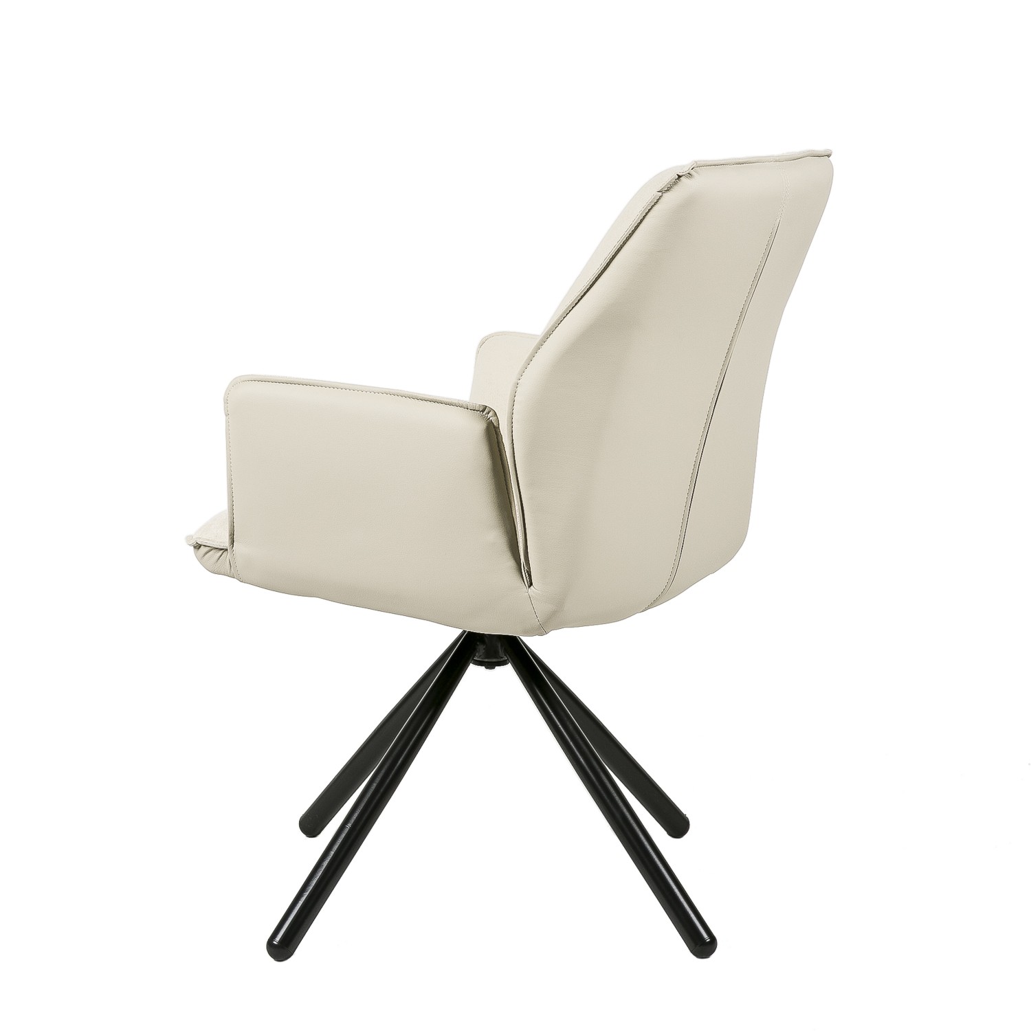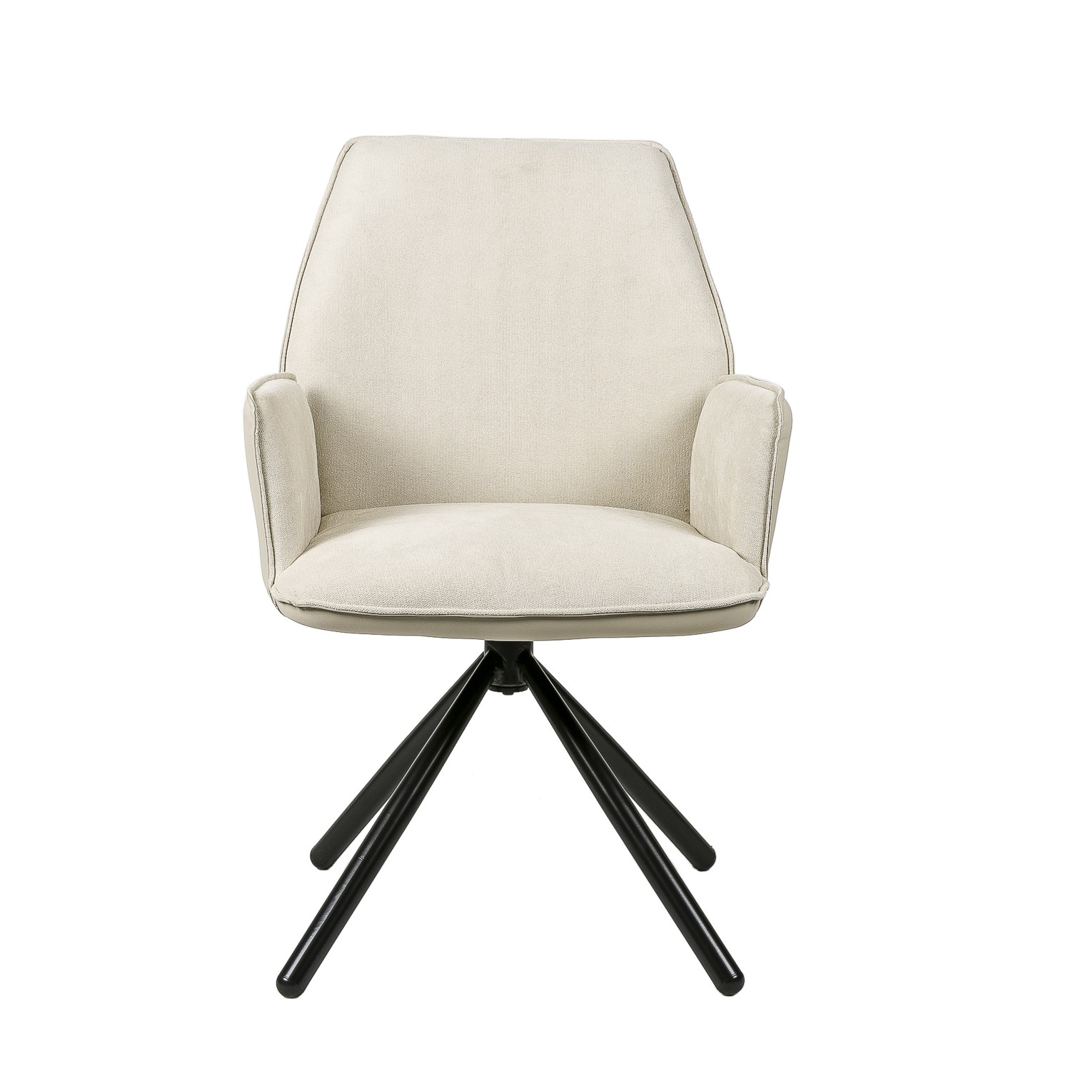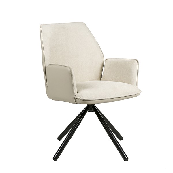 Se trata de un modelo giratorio, y que consta de un asiento y un respaldo tapizados en tejido en su lado interior, mientras que su cara exterior es de polipiel. Ambas terminan en color beige. Cuenta con cuatro patas de metal acabadas en color negro, presentadas en forma piramidal con el objetivo de conseguir una mayor estabilidad.
