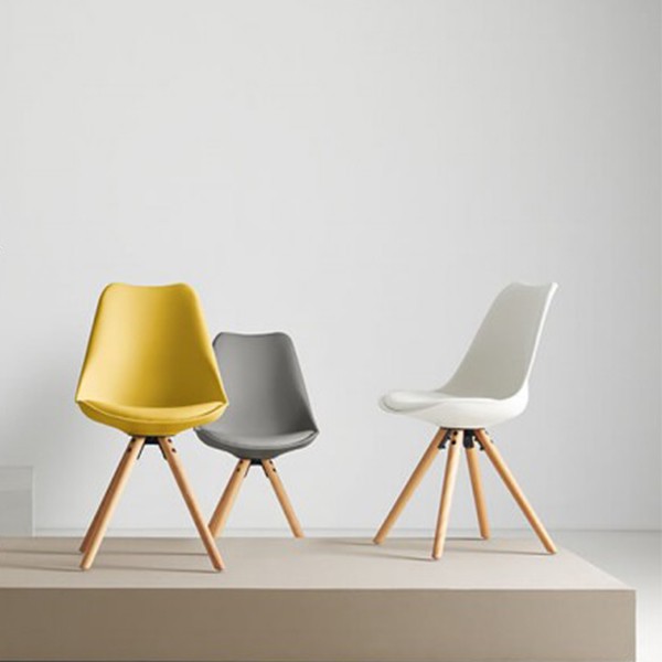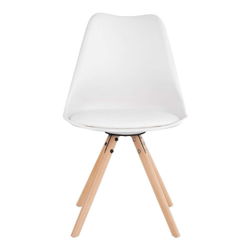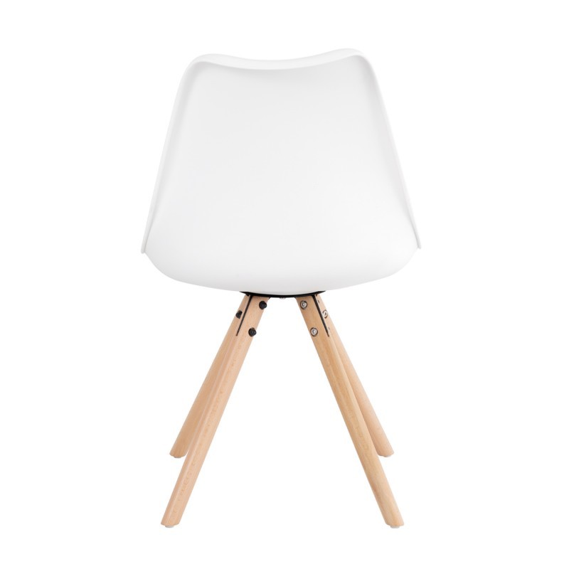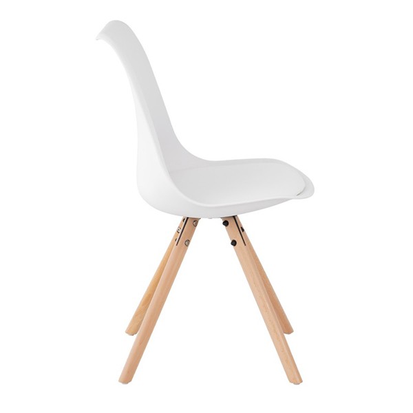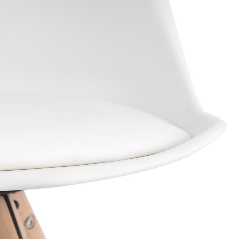 La silla de comedor FLAK está fabricada en plástico polipropileno blanco con cojín tapizado de polipiel de primeras calidades, del mismo color y tiene unos pies en forma de trípode hechos en madera de haya natural barnizada, la cual nos recuerdan a otros diseños como es la famosa silla DSW o también la silla TULIP.