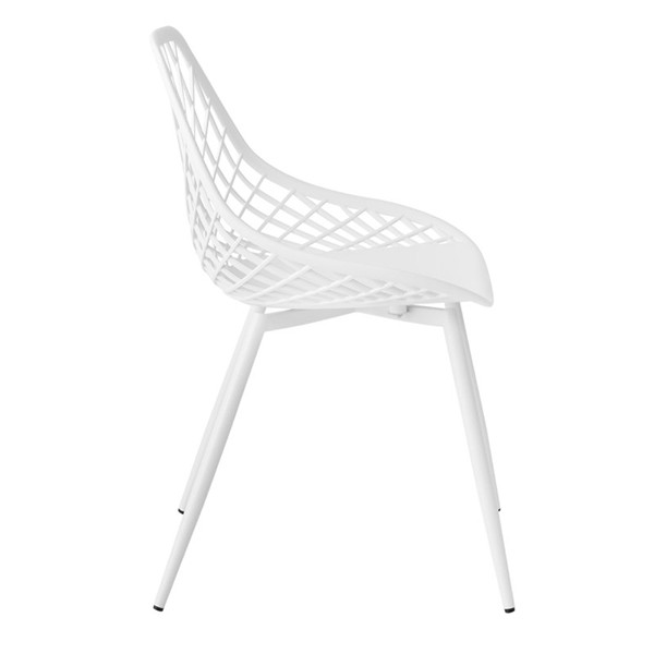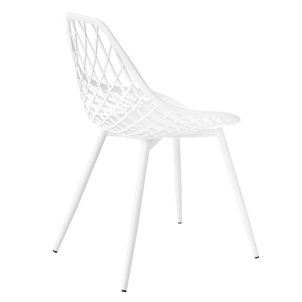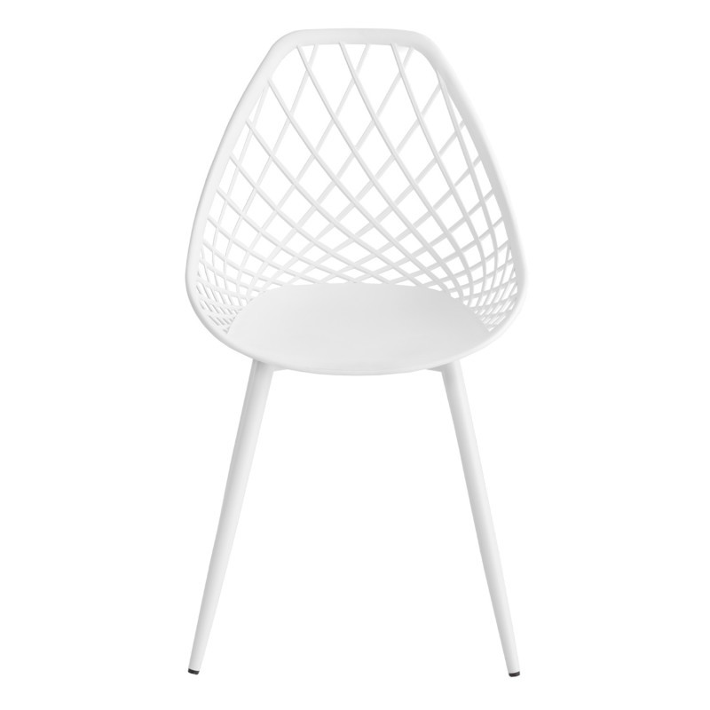Se trata de la silla de comedor LHAR, una bonita y sencilla silla con estructura de patas en metal y asiento de una sola pieza, con respaldo original, en polipropileno de color blanco. Su forma geométrica le da un toque moderno y original. A parte de su originalidad le otorga un aire decorativo a tus estancias.