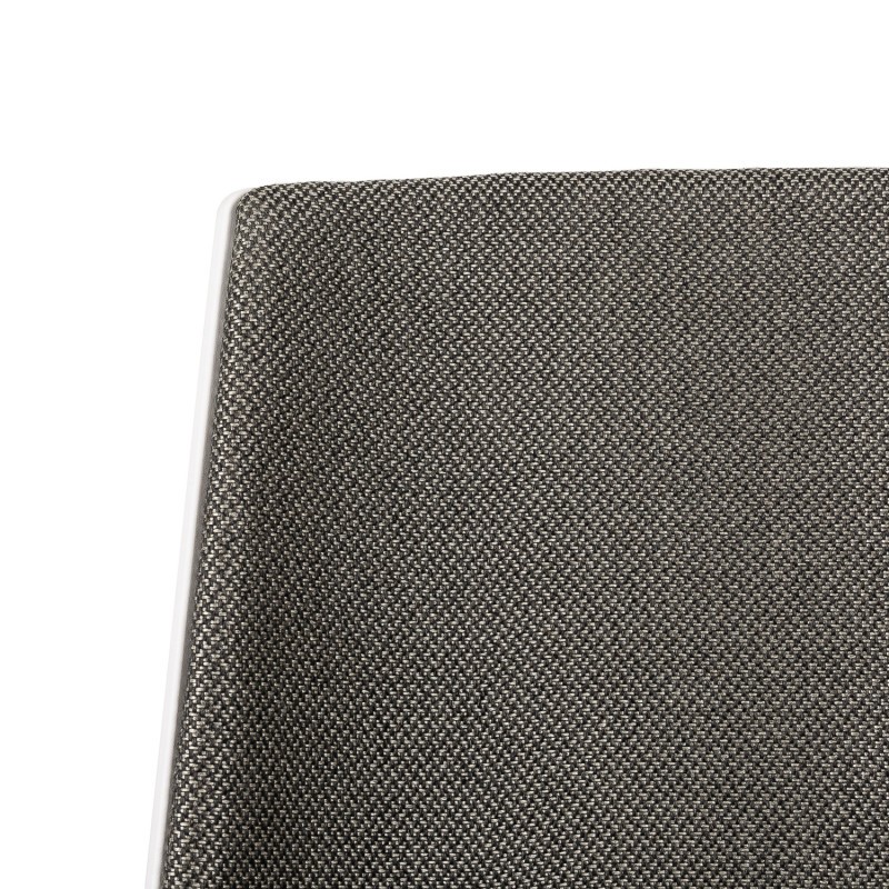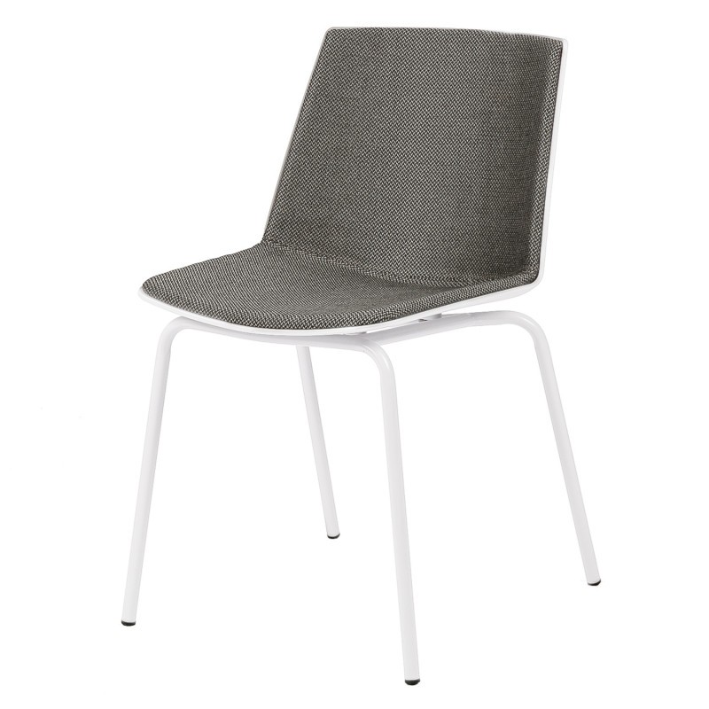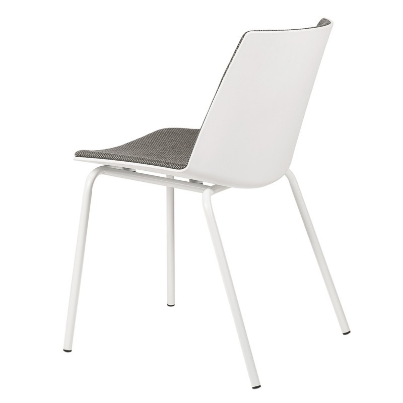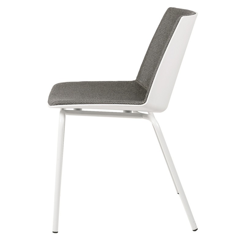 Es una silla moderna y original, formada por un asiento y un respaldo, ambos realizados en plástico de color blanco. Toda la parte delantera está tapizada en tejido jaspeado de color gris oscuro y concluye con una estructura que soporta el peso, diseñada y fabricada en metal de color blanco.