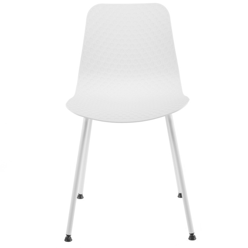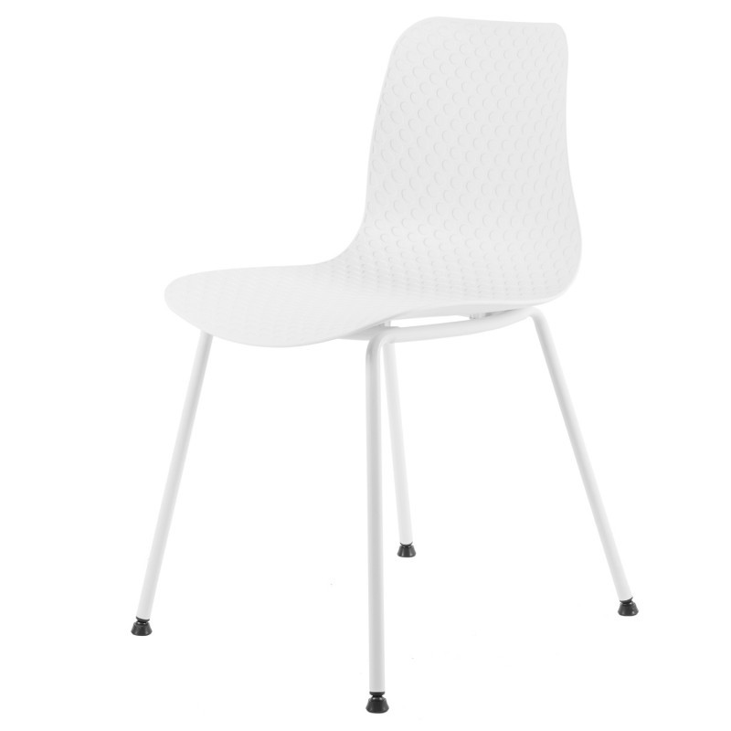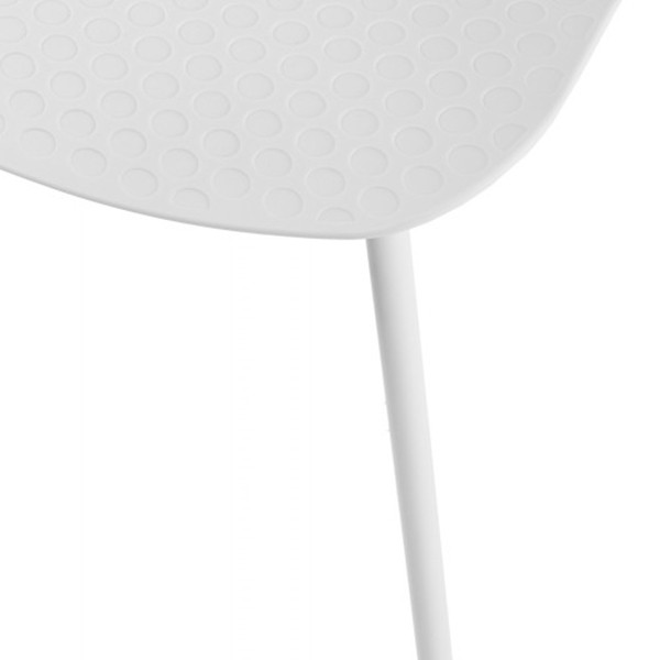 Se trata de la silla de comedor SALBEA, un modelo que emplea dos materiales totalmente distintos. Por un lado el polipropileno, un tipo de plástico de alta resistencia con el que han sido diseñados tanto el asiento como el respaldo, y por otro lado el metal de las cuatro patas. Si algo tienen en común ambos materiales es su acabado, en un bonito color blanco.