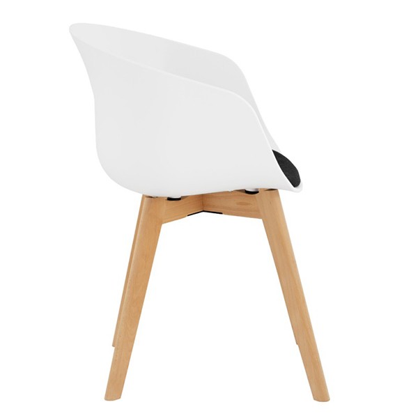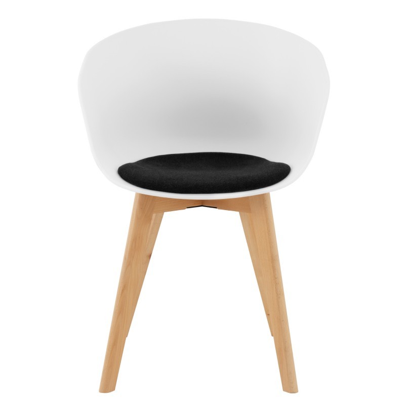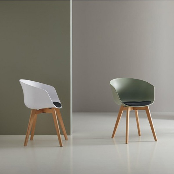 Así pues, si estás convencido en que las sillas de plástico ocupen alguno de los rincones de tu hogar, una gran opción es contar con la silla SUPER BISC FLAK. El plástico utilizado para su estructura es el polipropileno, acabado en color blanco con un mullido cojín tapizado en tejido de color negro, mientras que para las cuatro patas, la elección ha sido utilizar la madera de haya natural en forma de cruz.