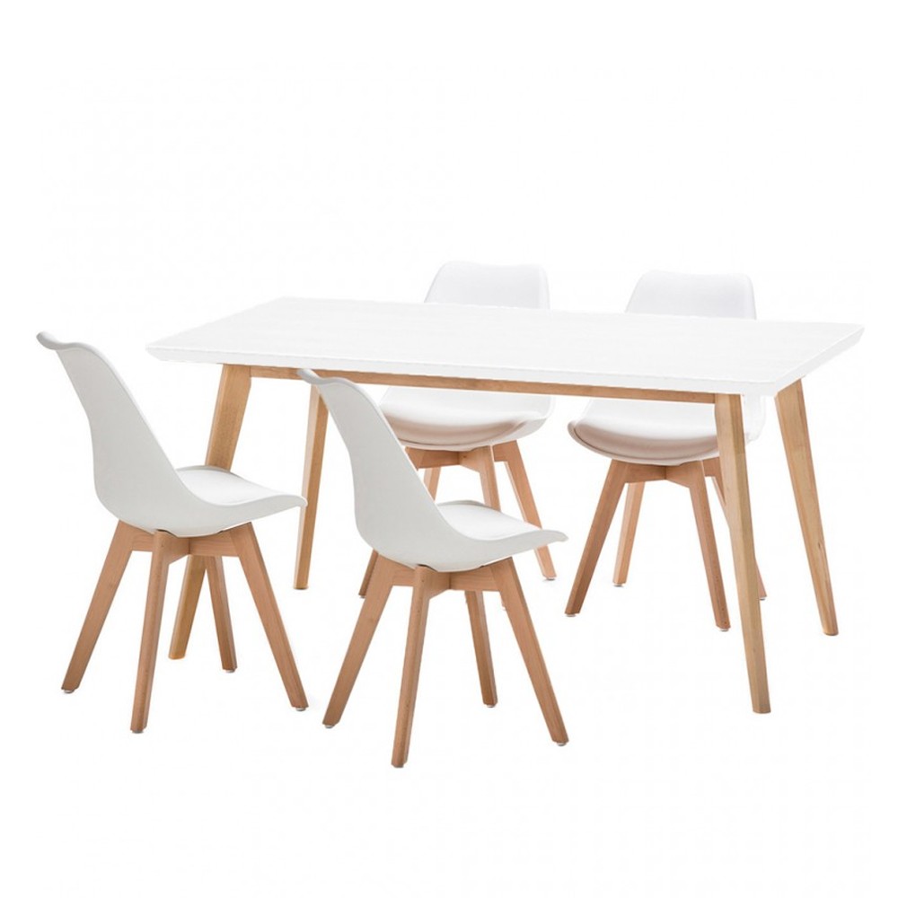 La silla de comedor SUPER FLAK está fabricada con un asiento y respaldo de una sola pieza de plástico polipropileno blanco con mullido y confortable cojín de espuma de alta densidad tapizado en polipiel del mismo color. A ello se le añade unas patas con forma cuadrada y de cruz de robusta madera de haya natural barnizada.