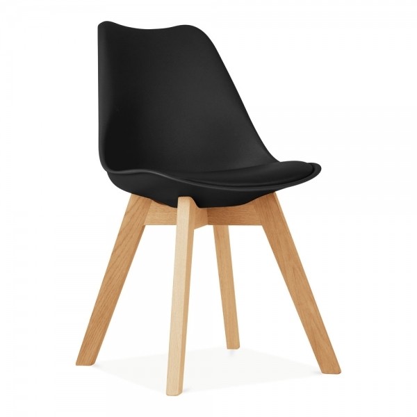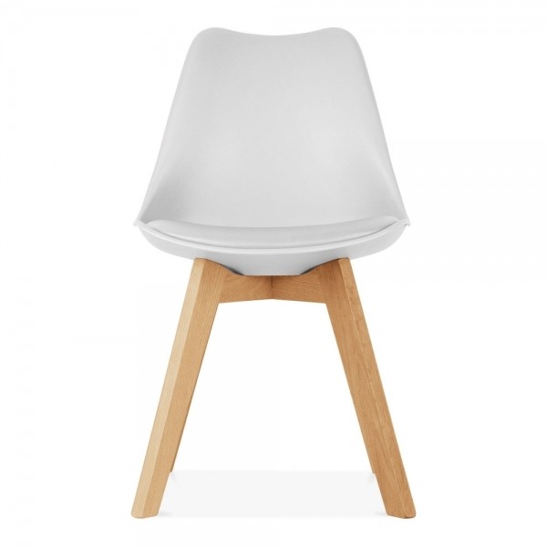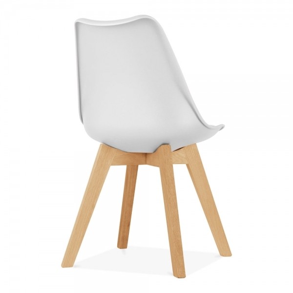 La silla de comedor SUPER FLAK está fabricada con un asiento y respaldo de una sola pieza de plástico polipropileno blanco con mullido y confortable cojín de espuma de alta densidad tapizado en polipiel del mismo color. A ello se le añade unas patas con forma cuadrada y de cruz de robusta madera de haya natural barnizada. Su moderno asiento nos recuerda a otros diseños como la famosa silla DSW, con la diferencia que los modelos SUPER FLAK añaden su peculiar cojín fijo. De ahí que pueda también recordarnos a las sillas TULIP que se caracterizan por su cojín tapizado en el asiento. Si estás buscando una silla de diseño y quieres diferenciarte, sin duda este modelo debería estar en tu hogar, ya que te dará un toque de diseño y exclusividad allá donde la utilices. El modelo SUPER FLAK, de marcado estilo nórdico, también está disponible en otros colores y acabados, y es perfecta para cocinas, comedores o incluso gracias a su resistencia, para negocios, restaurantes o bares.