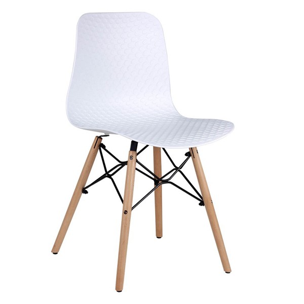 Consta de un asiento y un respaldo formando una sola pieza, y diseñado en polipropileno, un tipo de plástico acabado en color blanco y con un granulado que le da un toque de distinción. Le acompañan cuatro patas de madera de haya natural unidas por varillas de metal en color negro y que son las encargadas de aportarle una mayor fortaleza y estabilidad.