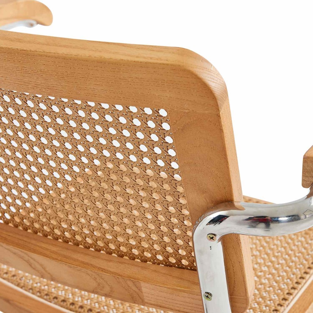 Fabricada su estructura en metal cromado y respaldo y asiento con marco en madera de olmo en tonalidad natural y ratán natural. Con una peculiaridad, que tanto el respaldo como el asiento tienen una forma más rectangular o cuadrada.