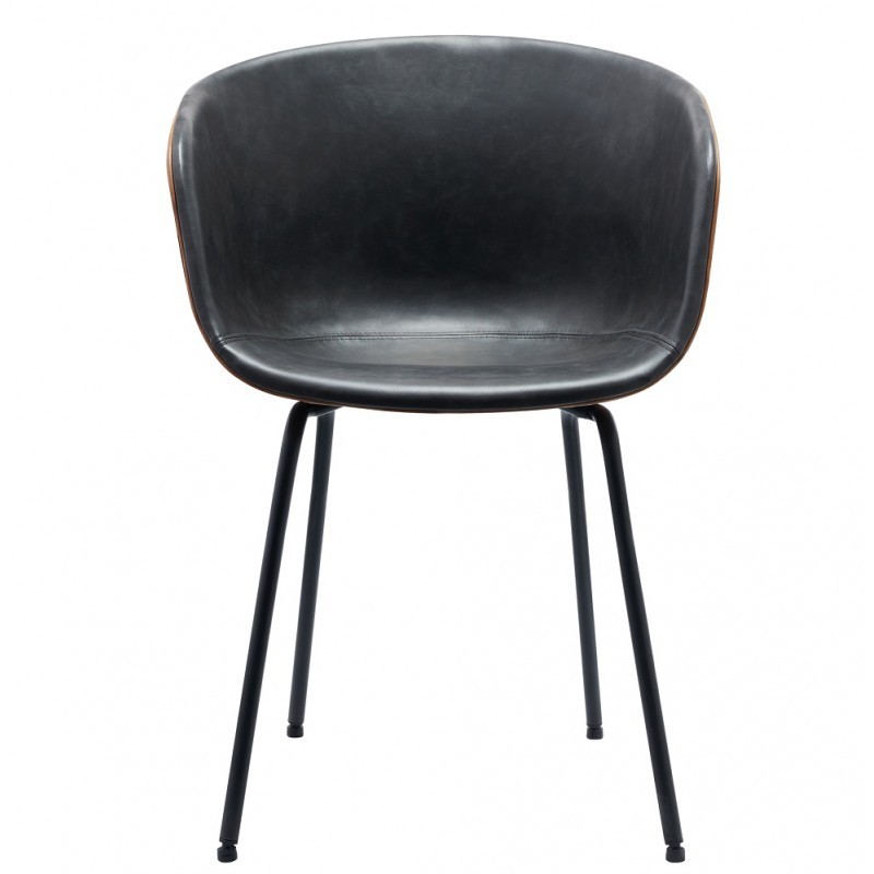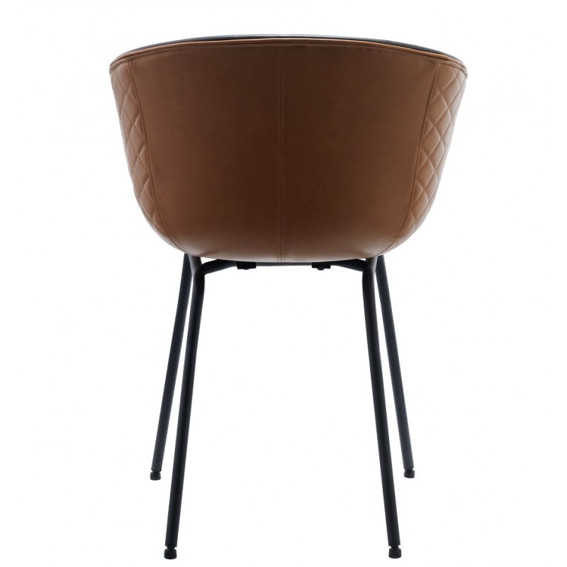 Con líneas modernas y con un cierto aire contemporáneo resulta agradable y elegante a la vista. Su asiento en forma curvada nos proporciona gran confort, siendo totalmente tapizada en similpiel. El interior en color negro y con costura de adorno alrededor del asiento. La parte exterior está también tapizada en color marrón cuero, con pespuntes de rombos y la zona central del respaldo liso.
