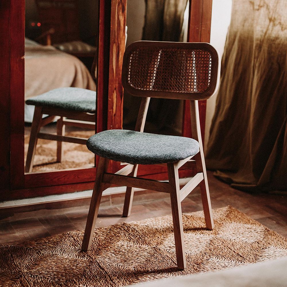 Su estructura está fabricada en madera maciza de olmo, su asiento está tapizado en textil color gris y su respaldo está elaborado en fibra natural de enea. Su estilo rústico es ideal para cualquier estancia de tu hogar o de tu negocio, también hay que destacar que su asiento goza de acolchado para darle una mayor comodidad.