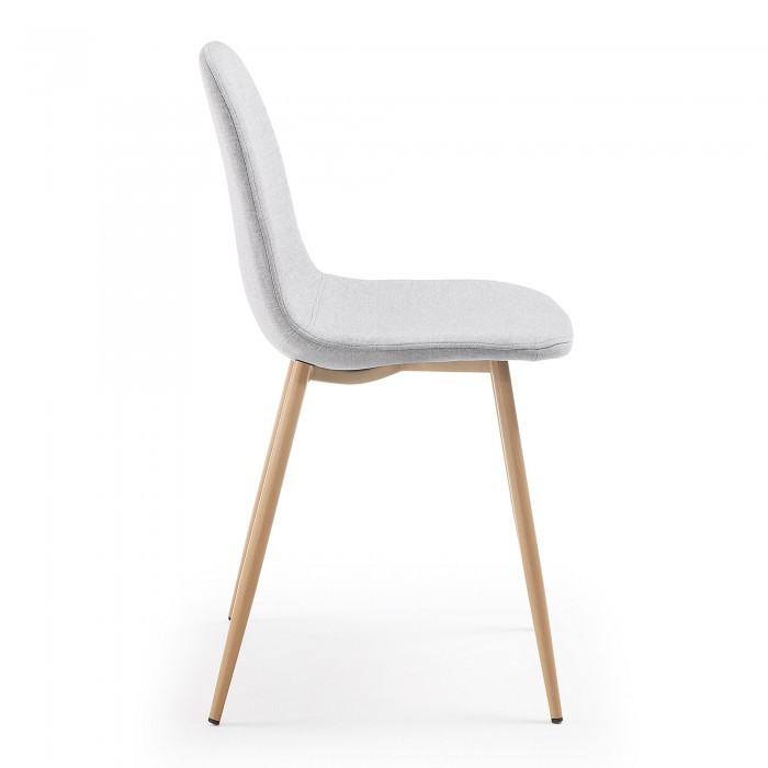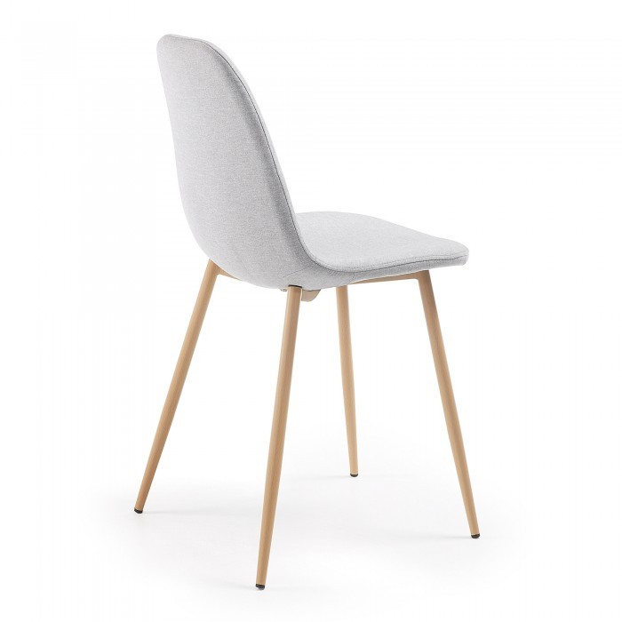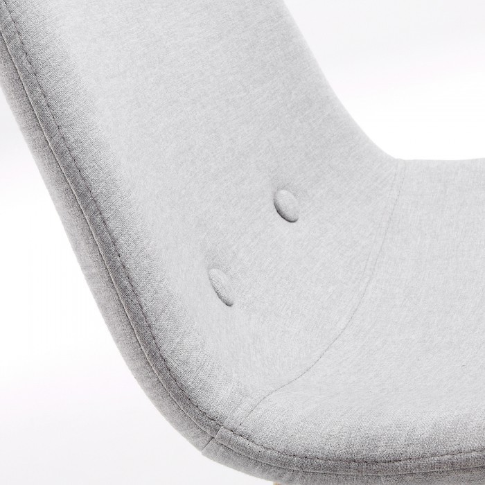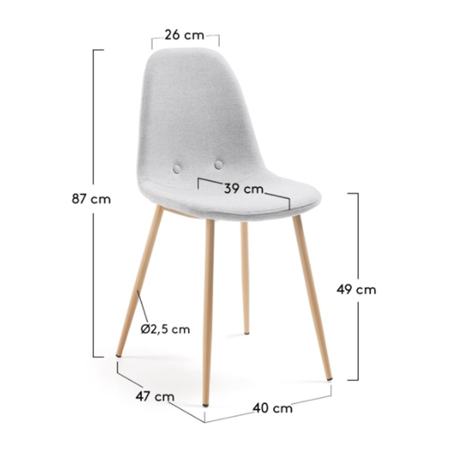 Se trata de la silla de comedor ARAMAT, un modelo formado por un asiento y un respaldo de pieza única, tapizada en tejido de color gris claro. En la parte del respaldo dispone de dos botones decorativos a fin de contar con un mejor acabado. Y todo ello se sostiene gracias a cuatro patas de metal con efecto a madera de haya.