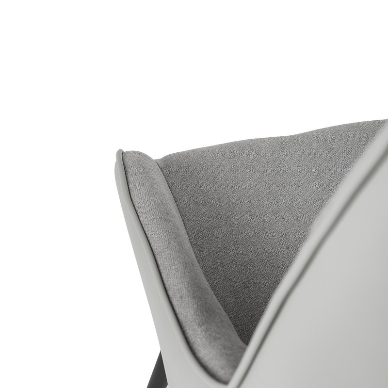 Hablamos de un modelo moderno, formado por un asiento y un respaldo tapizados, en su cara interior por tejido y en la exterior por polipiel, siendo el gris claro el acabado final de ambas. Le acompañan cuatro patas en forma de araña y realizadas en metal negro.