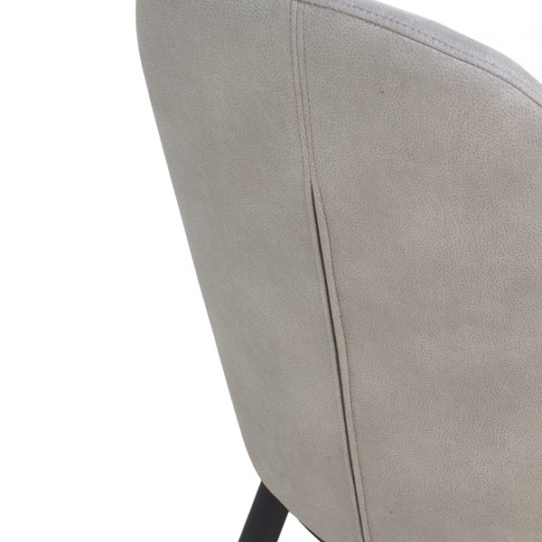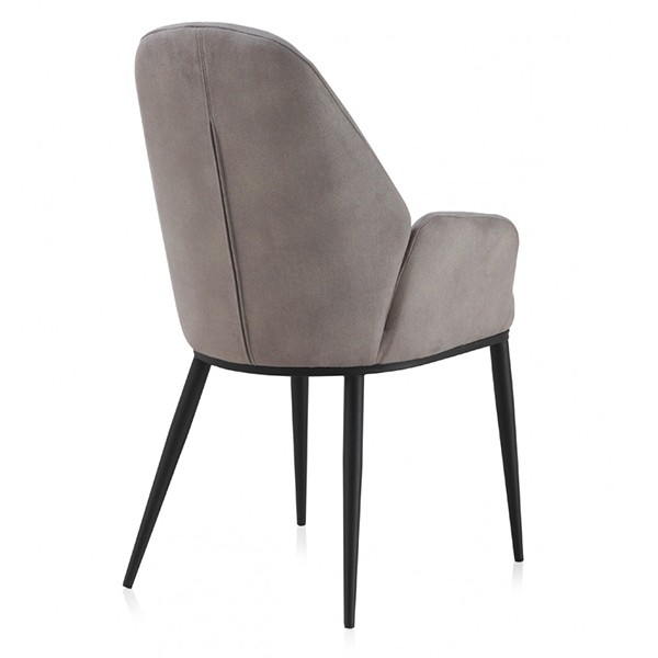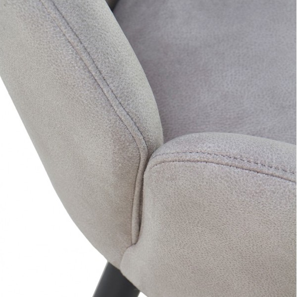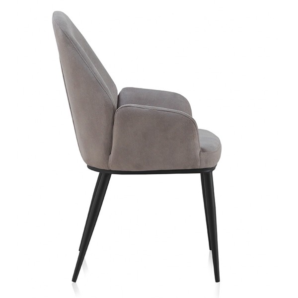 Asiento tapizado en tejido de poliéster en color gris claro, simulando nobuck con reposabrazos. Para sostener dicho asiento, encontramos cuatro patas tubulares realizadas en metal de color negro, obteniendo así una gran resistencia y fiabilidad. Sus formas hacen que tu cuerpo se adapte a la perfección a ella y con eso se consigue una mayor sensación de comodidad.