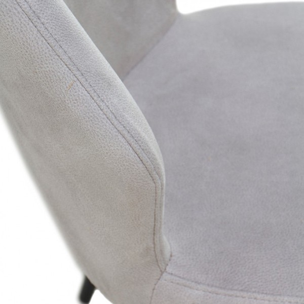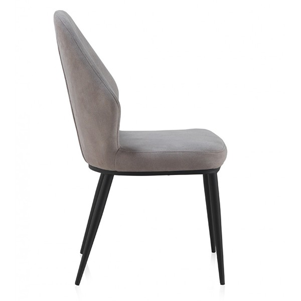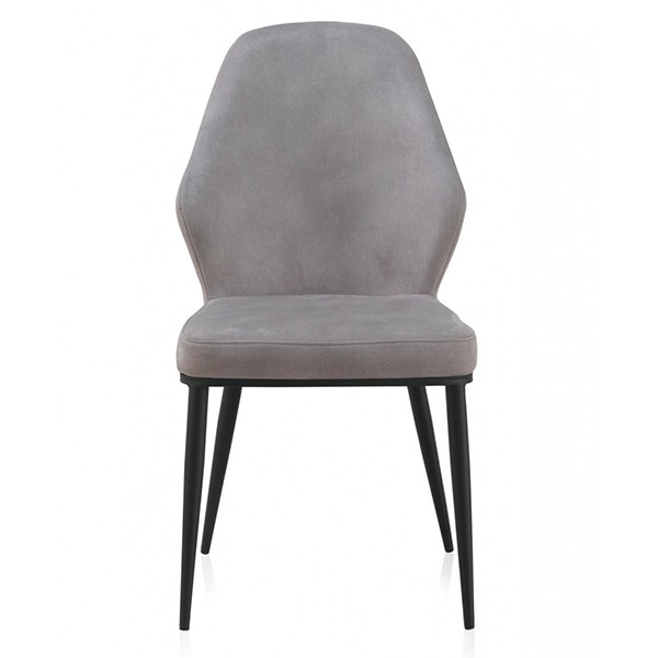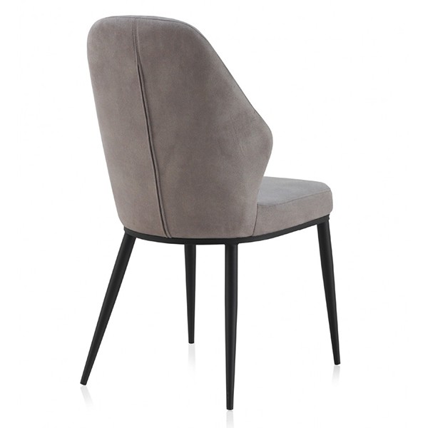 Una silla de asiento mullido y cómodo tapizado en tejido de poliéster, suave simulando nobuck. Con un respaldo peculiar con forma geométrica; en la parte inferior cuatro patas metálicas lacadas en color negro.