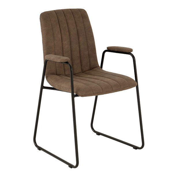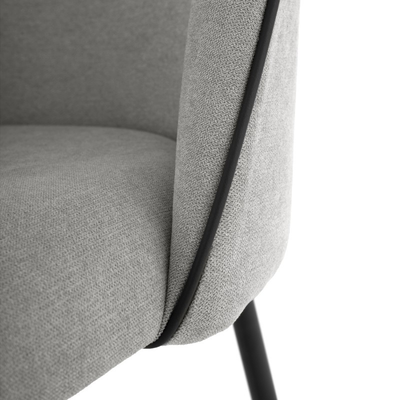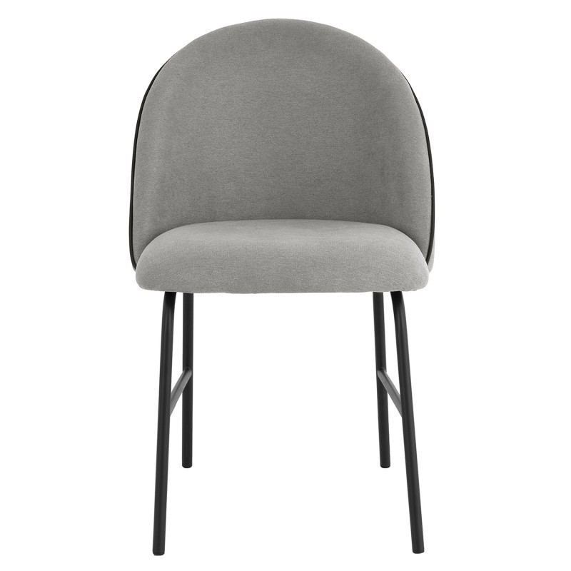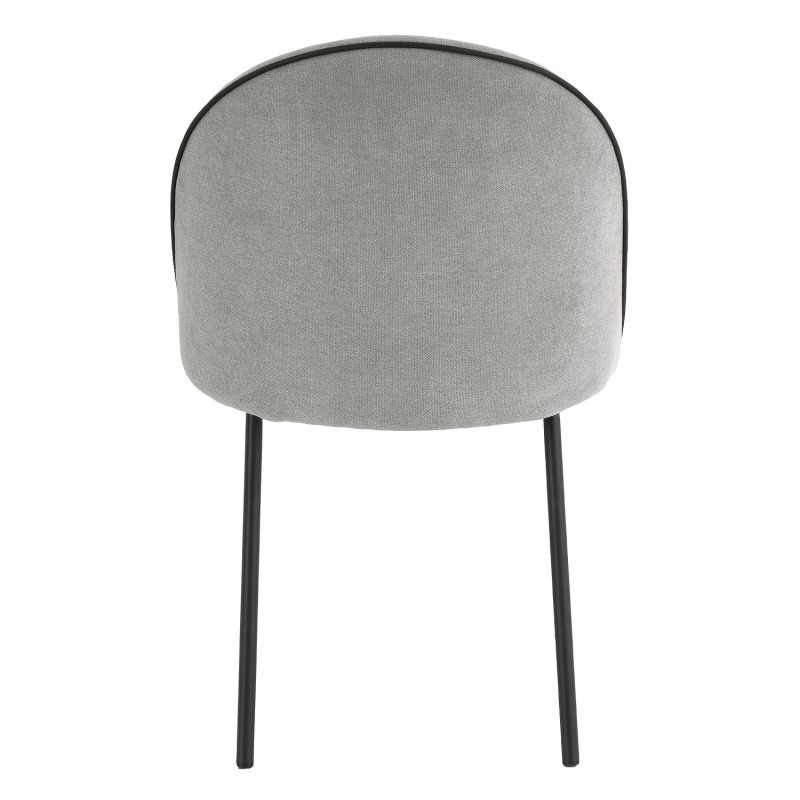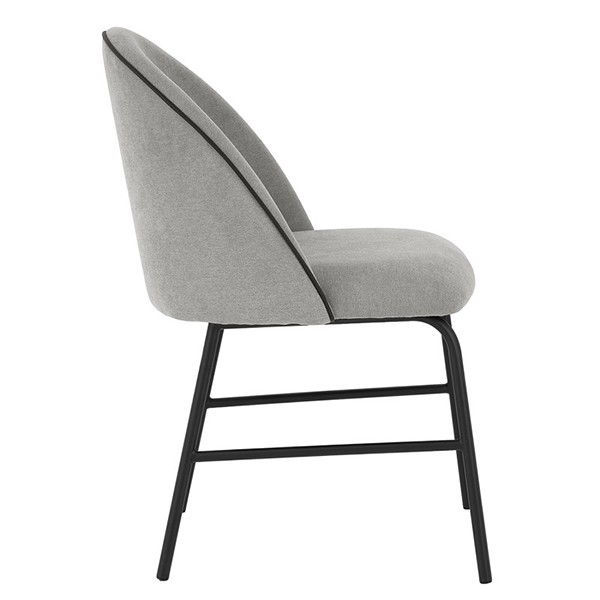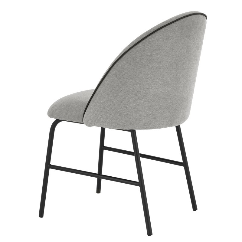 Una silla con asiento acolchado tapizado en tejido de color gris claro, con ribete en el respaldo que da un toque más elegante y diferente. En cambio para su estructura sus líneas son mas sencillas en metal tubular en color negro.