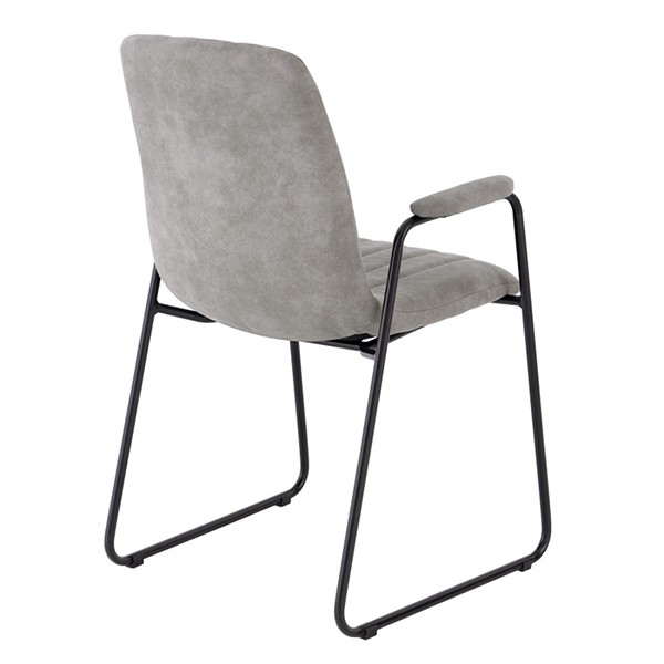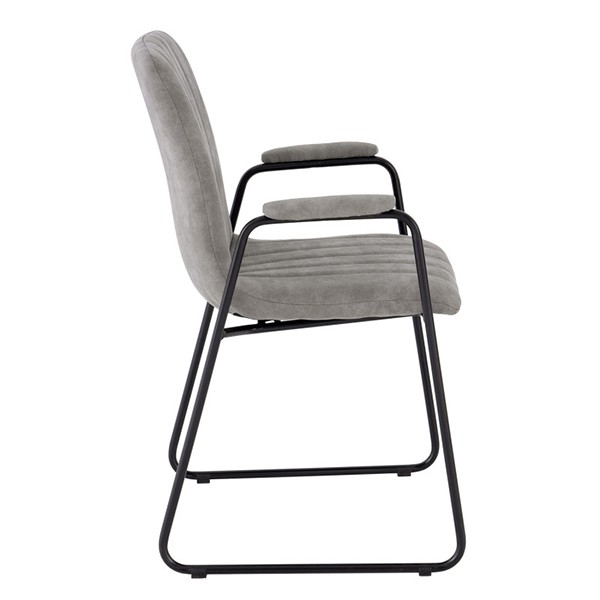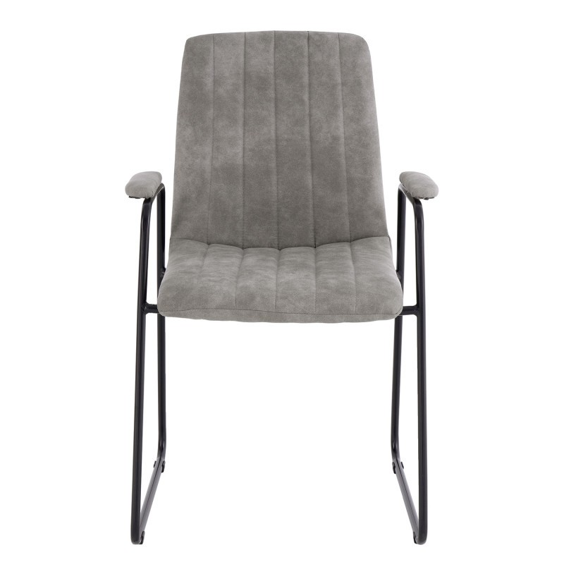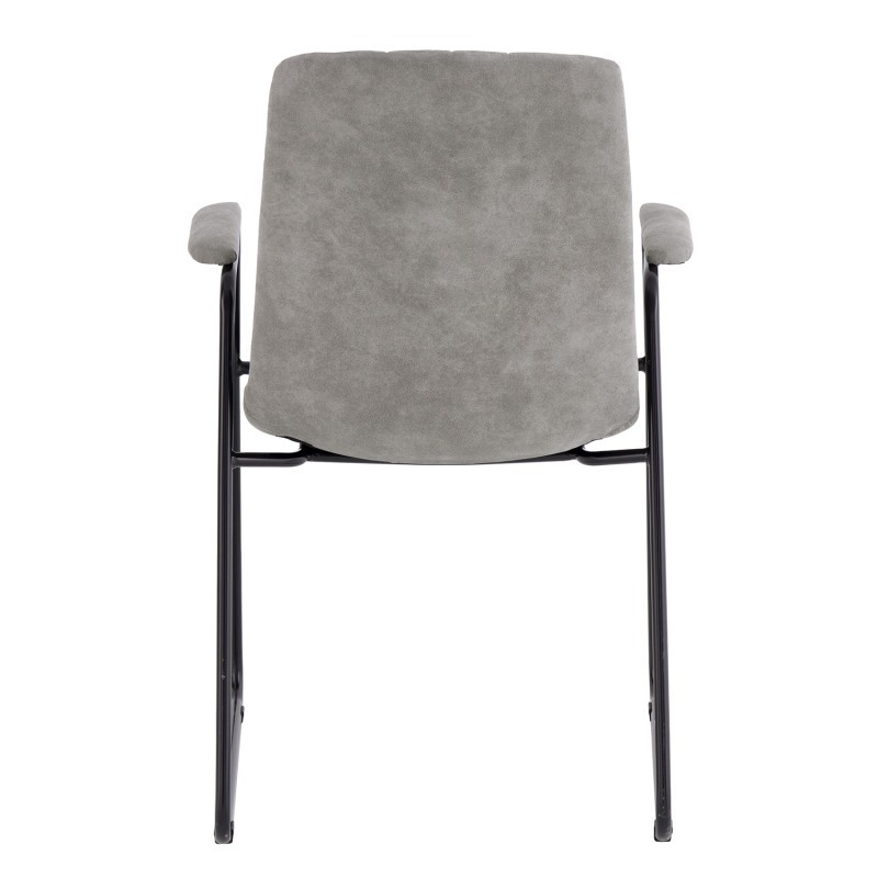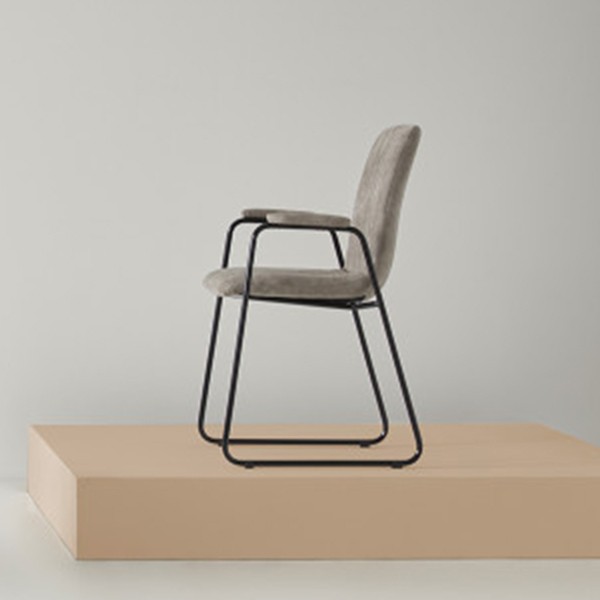 Estructura en metal de color negro que cuenta con dos patas en forma de patín en paralelo asiento y reposabrazos tapizados y mullidos en tejido de poliéster en color gris claro. De un diseño sencillo pero elegante, cómoda y resistente.