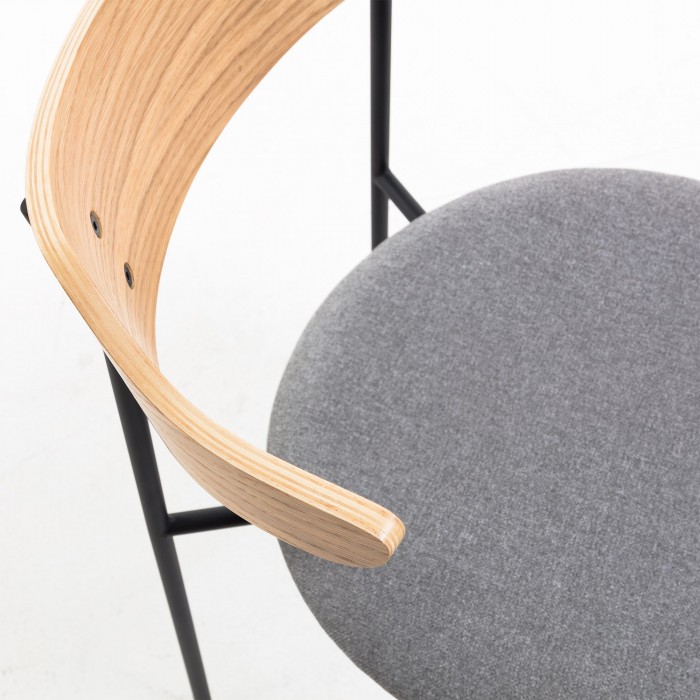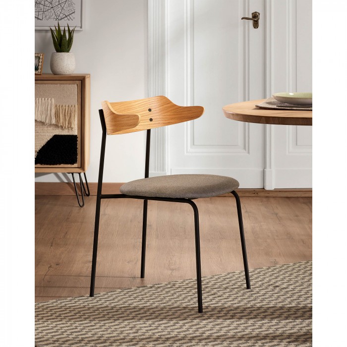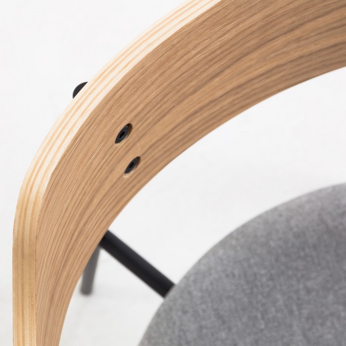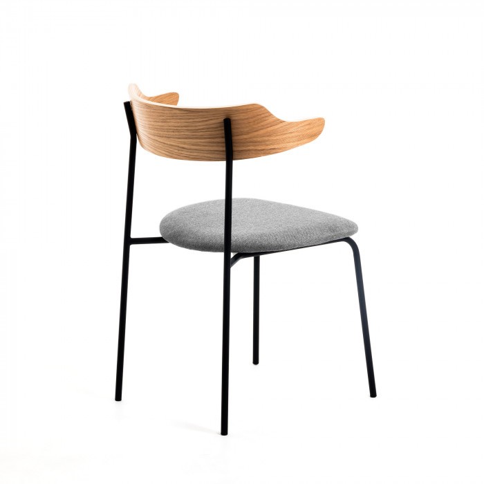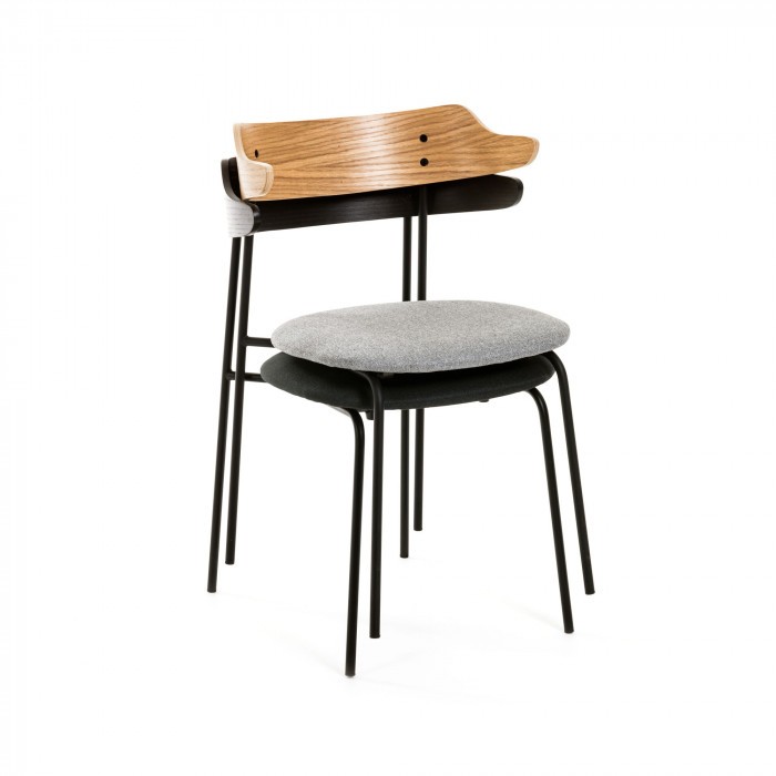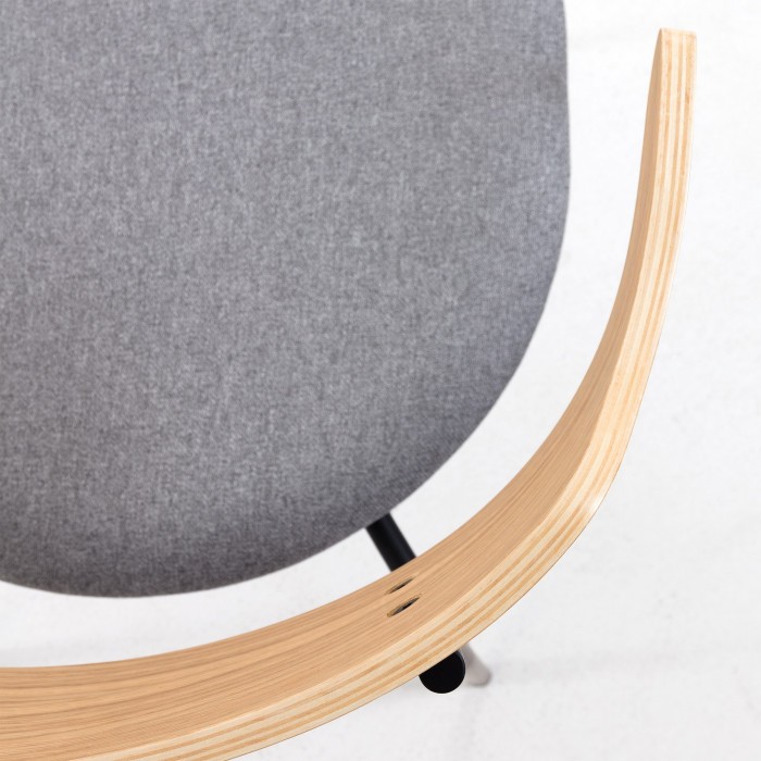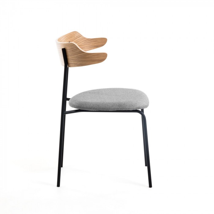 Y es que, por un lado, encontramos cuatro patas metálicas en acabado de color negro mate, un asiento en acolchado realizado en tejido de color gris claro, y un respaldo moldeado, en el que tu espalda adquirirá una postura adecuada, y que ha sido diseñado en madera de roble natural.