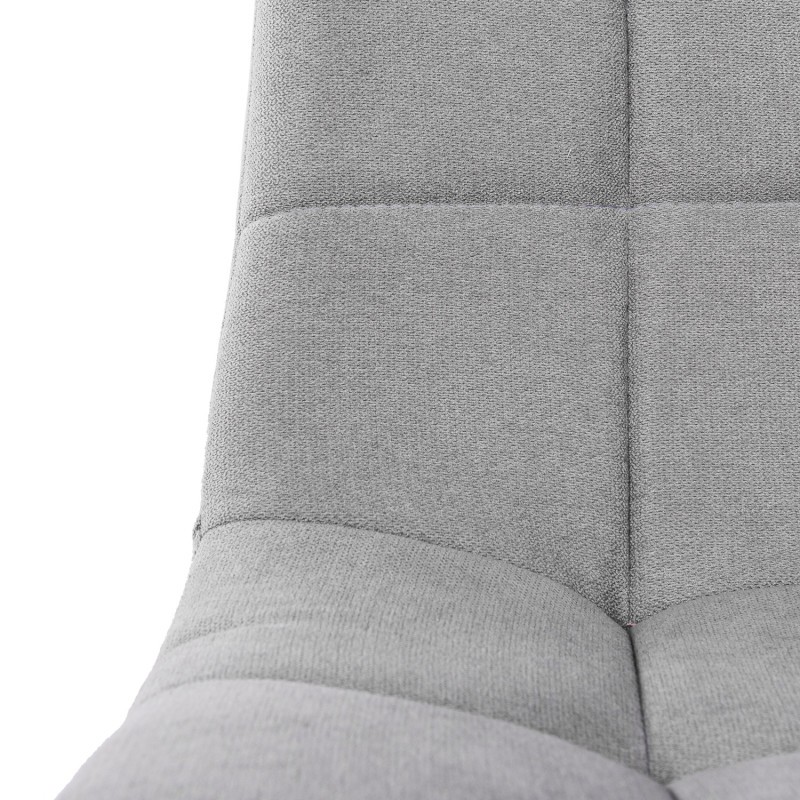 Se trata de la silla MALTA, una versión con el asiento y el respaldo tapizados en tejido de color gris claro. Cuenta con cuatro patas, presentadas en forma cónica y realizadas en metal con acabado en color negro.