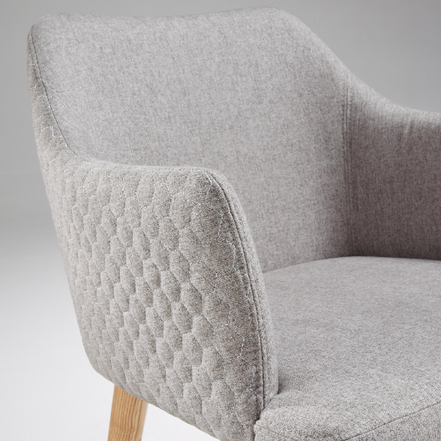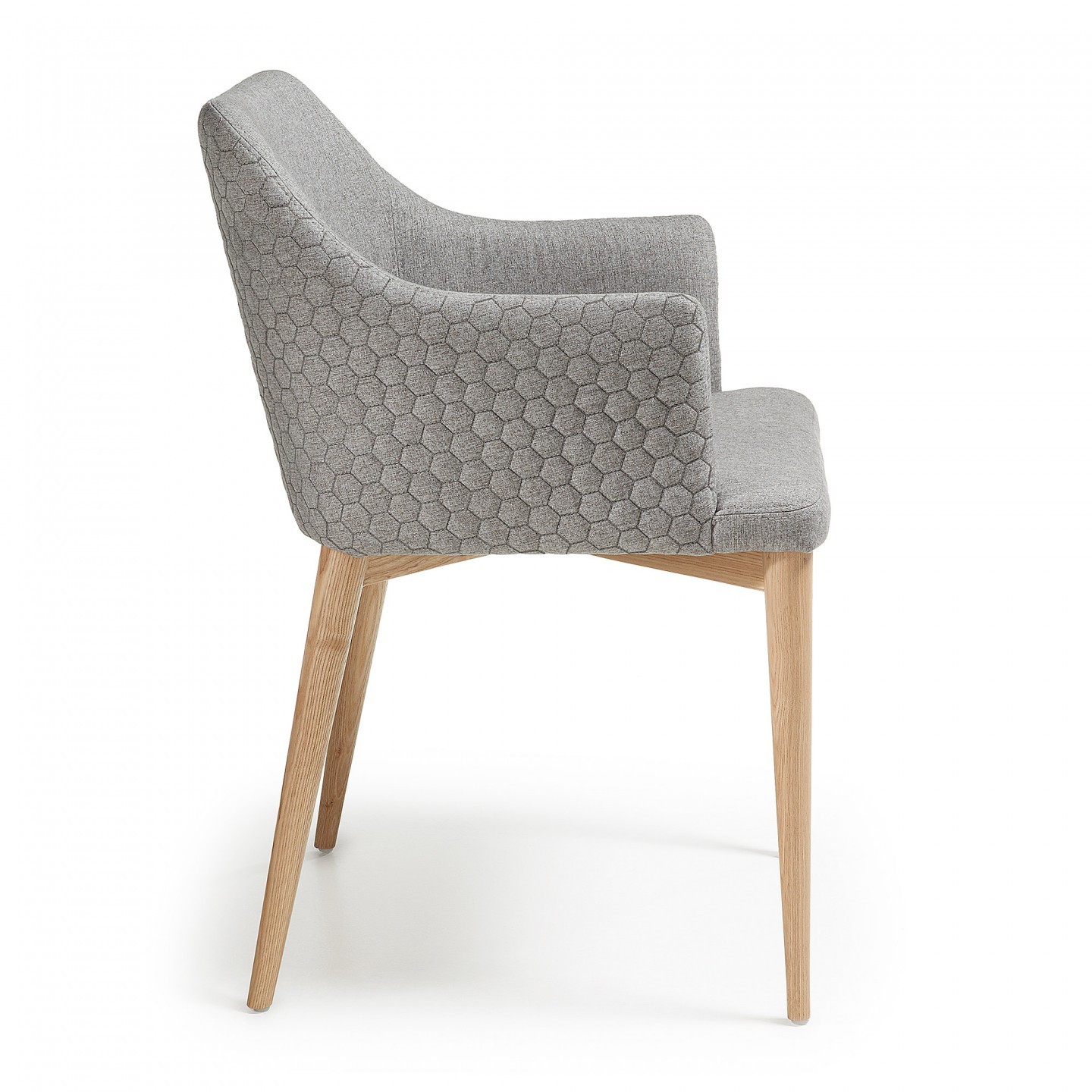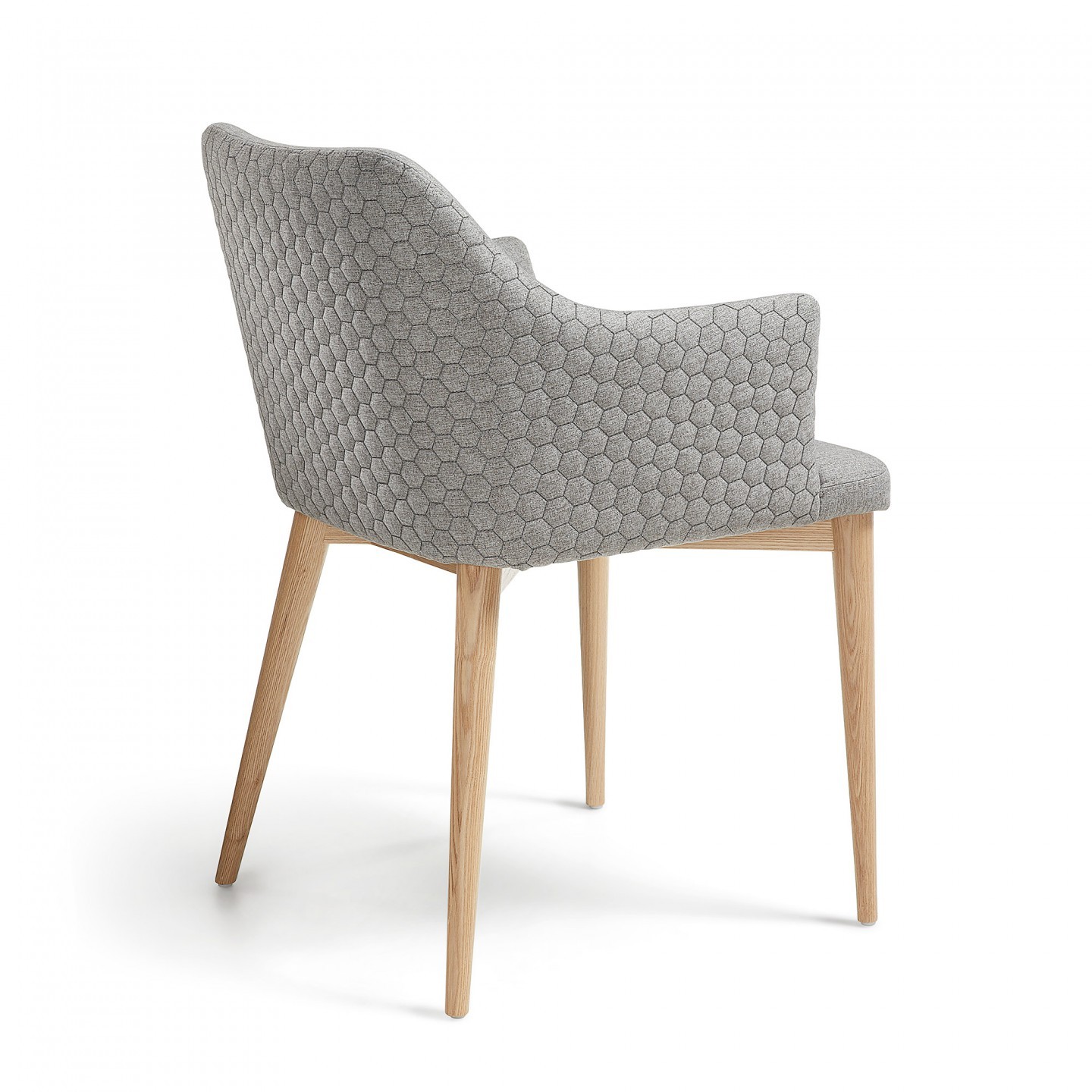Se trata de una silla de corte clásico, tapizada en tela en color gris claro con la parte posterior acolchada. Dispone de brazos para mayor comodidad. Concluye con cuatro pies en madera maciza de fresno que le otorgan una gran firmeza.