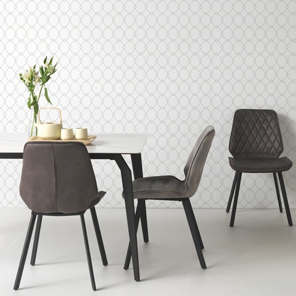La silla de comedor ROB presentada en color gris claro con sus singulares puntadas en forma de rombo tiene un bonito diseño moderno y su comodidad la hace más exclusiva. Si necesitas una silla para tu comedor, elígela, no te dejará indiferente. Creará un ambiente agradable y especial con el que disfrutar su estética y confort. Elaborada con un tapizado blando en respaldo y asiento 100% poliéster de un especial color gris claro acompañada de sus patas negras metálicas. Deléitate con su armonía y bienestar y convierte tu comedor en un espacio casual. La podrás encontrar también tapizada en color gris oscuro.