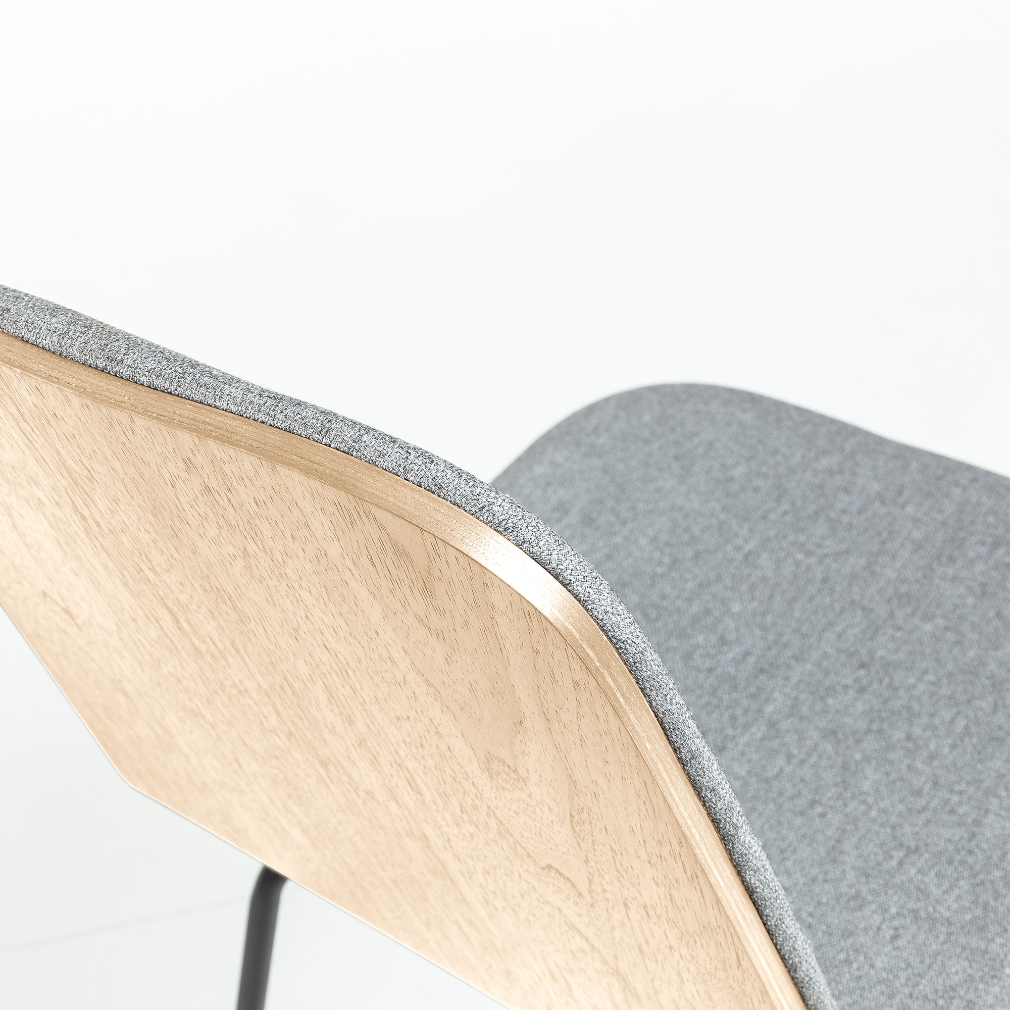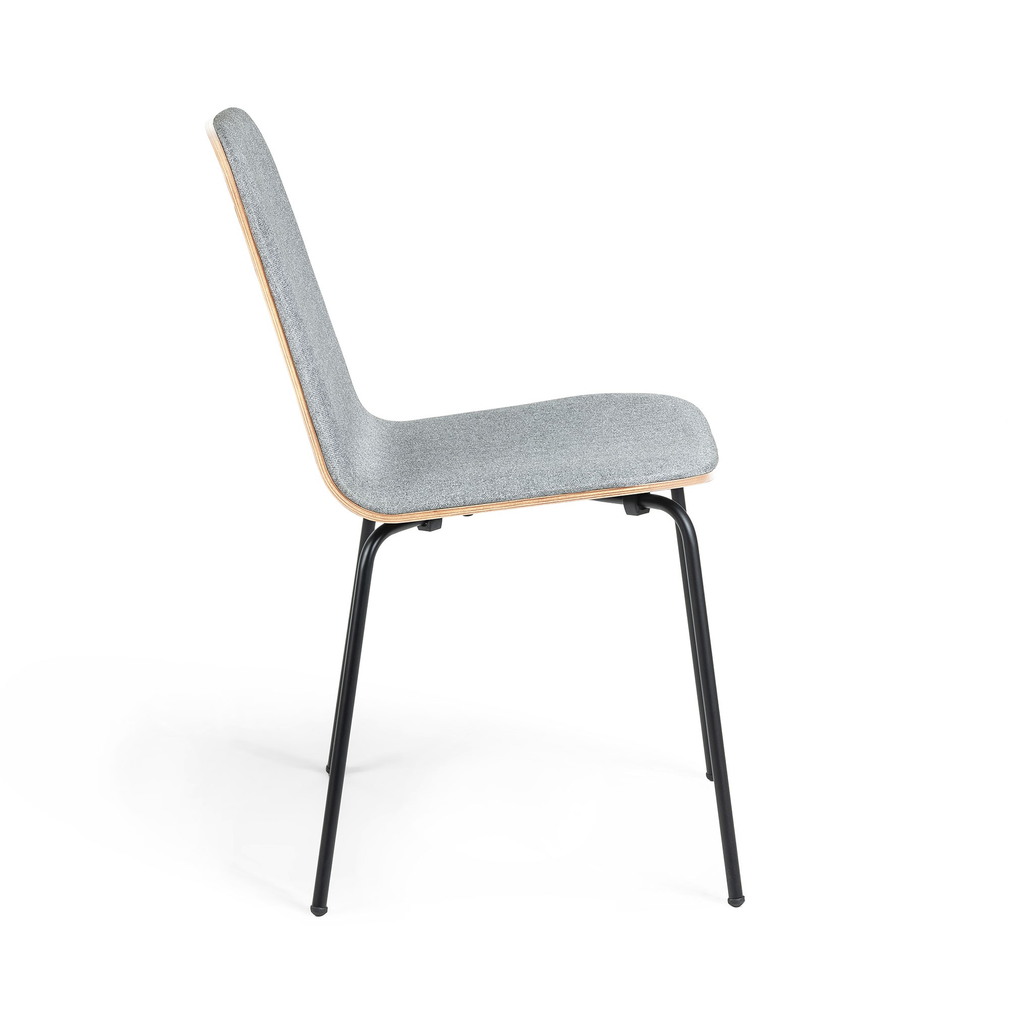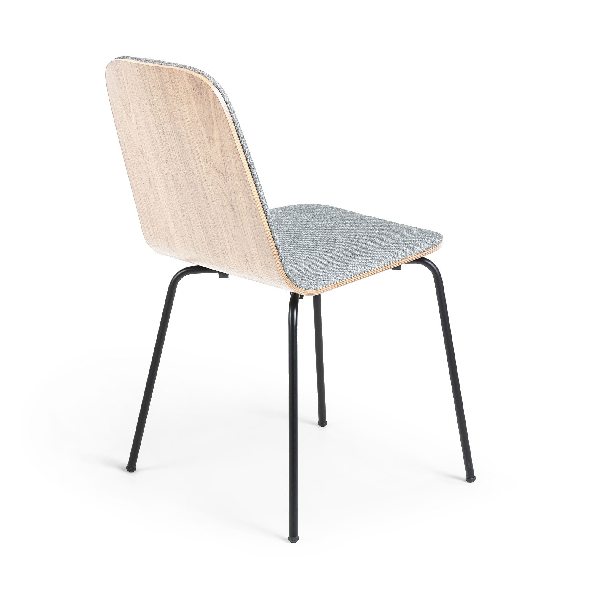 Se trata de un modelo apto para todo tipo de salones y comedores, sin distinción alguna. Por un lado, encontramos un asiento y un respaldo tapizados en tejido acabado en color gris, mientras que la cara exterior de ambos ha sido realizado en madera contrachapada de roble natural. Para las patas, en cambio, con el objetivo de buscar una mayor firmeza, se ha optado por el metal en color negro.