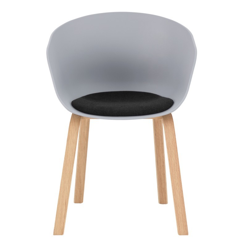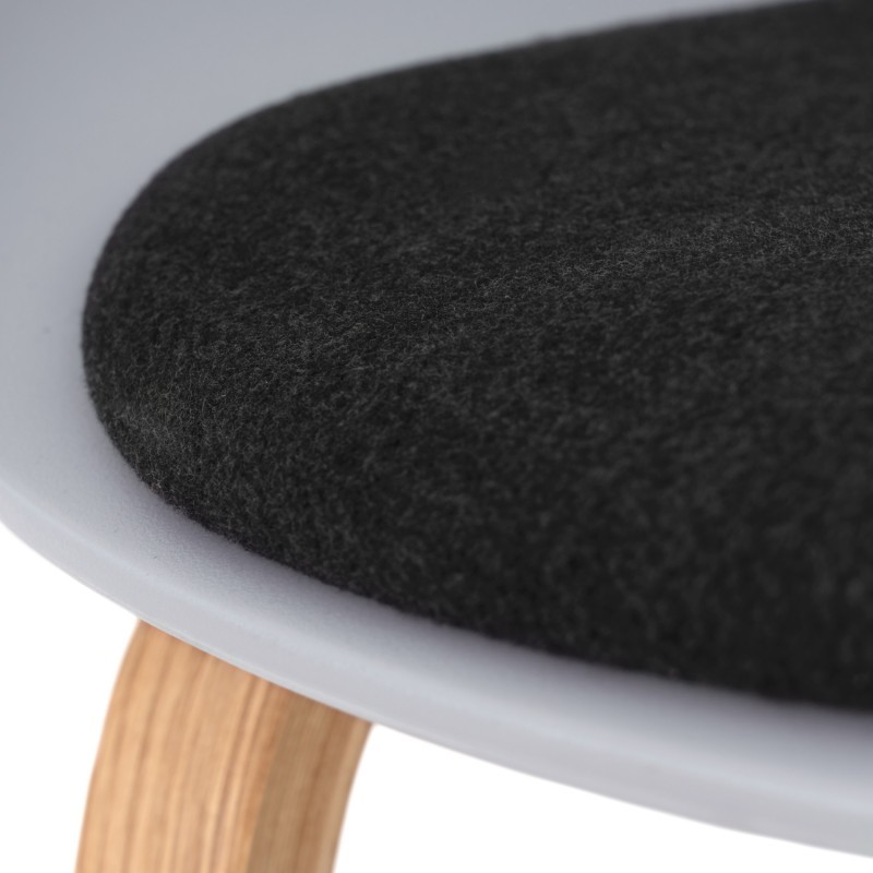 Una silla perfecta tanto para el hogar, como el salón-comedor, dormitorio, como para negocios ya sea de hostelería, sector médico, boutiques de moda o amueblar un office por sus materiales. Fabricado su asiento de una sola pieza en polipropileno de color gris, con cojín tapizado en tela de color negro y estructura de patas en madera de haya curvada en tonalidad natural.