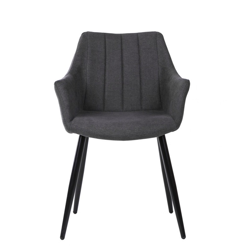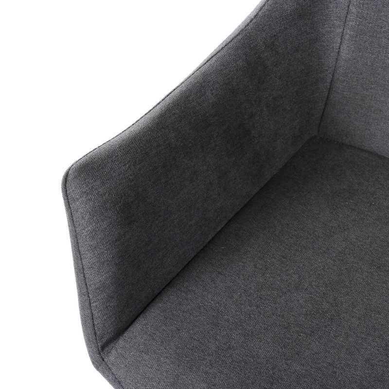 Moderna, consta de cuatro patas de forma cónica, realizadas en metal acabado en color negro. Estas patas se encargan de sostener un asiento tapizado en tejido gris oscuro, con pespuntes decorativos para un gran acabado, así como brazos para una mayor comodidad del usuario.