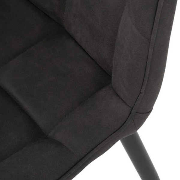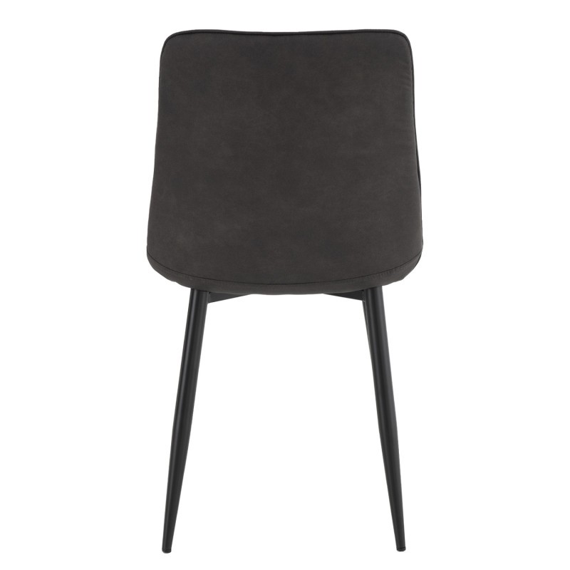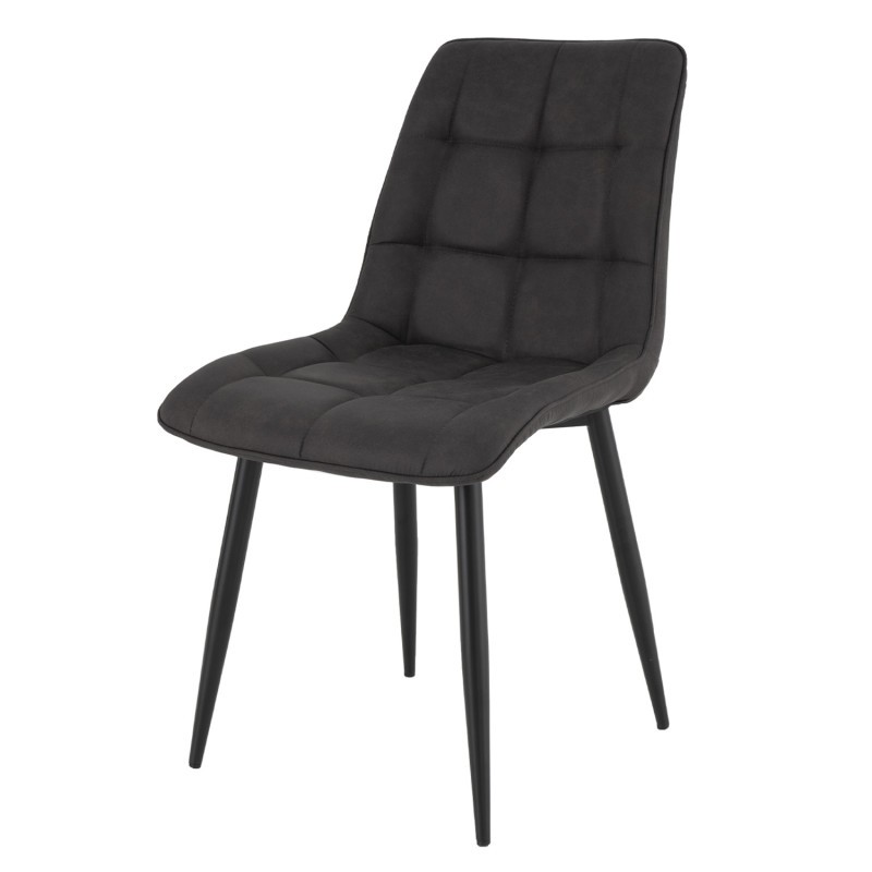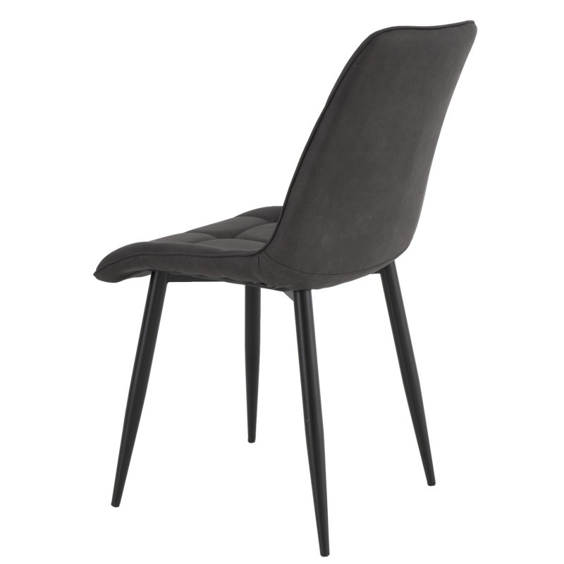 Se trata de la silla de comedor FILOMENA, la cual está tapizada, muy elegantemente, en polipiel de color gris oscuro. Como elemento decorativo, en la parte interna de la silla, dispone de unos pespuntes decorativos en forma de cuadrados. Además, alrededor de todo el perfil de la silla encontramos un filo pespuntado que le dan un mejor acabado.