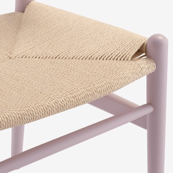 El modelo está realizado en madera de haya lacada en color lila claro y asiento reforzado en ratán trenzado ecológico. Respaldo curvado con reposabrazos unido al asiento por una pieza en forma de Y. Elegante y sencilla a la vez para el hogar o negocios de hostelería y restauración.